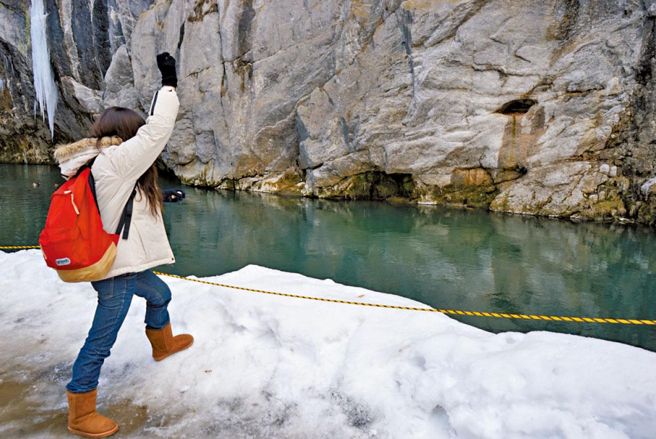 船程尾段登岸看大猊鼻岩,高124米的岩壁上有一凸起處,形如獅子鼻,猊鼻溪之名因此而來,鼻孔延伸結了冰柱,天氣太冷,可能獅子也傷風。鼻下靠近水面有一小洞,據說把祈福石子投進小洞,便能願望成真,我和同伴試過幾回也不成功,難度好高呢!