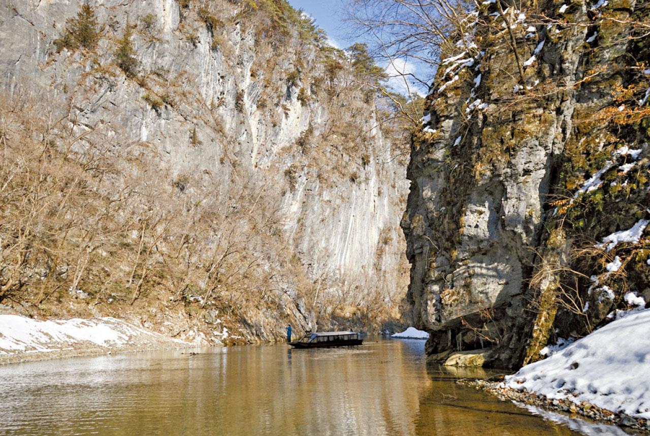 最佳觀光方法是乘船,坐進加裝了透明頂來擋風雪的屋形船,座位的枱下設有暖爐,把腳伸進去好溫暖;隨船導遊能說普通話,沿途介紹由石灰岩峭壁形成的壯夫岩、少婦岩、明鏡岩、錦壁岩等景點。即使天氣寒冷,河上仍有眾多野鴨,我付100日圓給船家要了包鴨糧,一點一點灑向溪流,野鴨趕快游過來,緊張得躍起飛出水面,好有趣的互動。