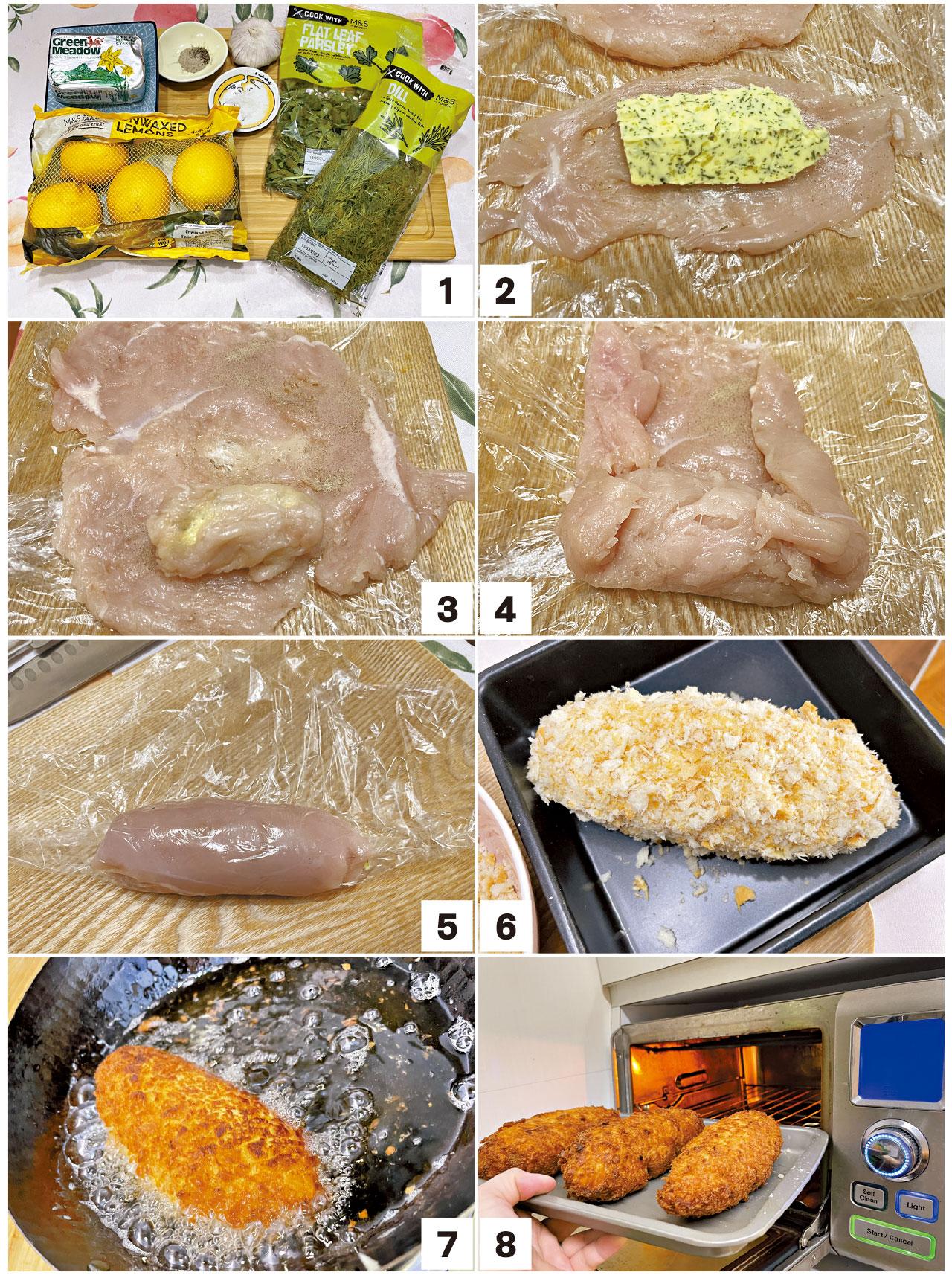 雞胸肉若附有雞柳,把雞柳拆出;大塊的那端雞胸肉則從厚肉處剖開、打開成雙飛肉片(butterfly)。砧板上放保鮮紙,再上放雞柳及雞胸肉,再鋪上保鮮紙,以平面鎚仔敲薄成大塊雞肉片,再以鹽及胡椒調味。雞柳包入一小塊香草牛油,放在雞胸肉上,捲記雞胸肉,注意不要暴露出牛油餡料。可利用保鮮紙將雞卷捲實,置冷凍庫冰半小時定型。之後滾上麵粉、蛋液、麵包糠,以手將麵包糠按壓在雞肉上,然後再沾一次蛋液及麵包糠,按壓,就可以拿去炸了。麵包糠最好是自己打的,將隔夜白麵包連皮用攪拌機打碎。將整理好的雞卷以熱油炸至外層金黃、變硬了,就要拿起,注意只需炸至上色,不用炸熟。然後放到預熱至攝氏160度的焗爐焗15分鐘,焗好後拿出,靜置5分鐘後才上菜,否則容易切開時濺出滾燙牛油以致燙傷。可配搭炸薯條或薯蓉和蔬菜食用。