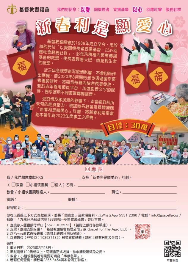 去年12月,團隊想到「如何有意義地運用兔年利是」這概念:《新春利是顯愛心》計劃 [註3] ,筆者覺得相當有創意!原因有三:(1) 這是一次性的活動,對有心人的壓力較細;(2) 這筆利是預算,不是直接從有心人的口袋裡淘,這筆款項其實是新的「進賬」;(3) 這項捐獻活動的形象很「潮」,倘有人問:「您今年逗了多少利是?怎樣運用?」您就可以答:「全數捐俾《新春利是顯愛心》計劃,去資助他們疫情復常後的探訪關顧長者事工」。是否有點特別?帶一點「潮」?