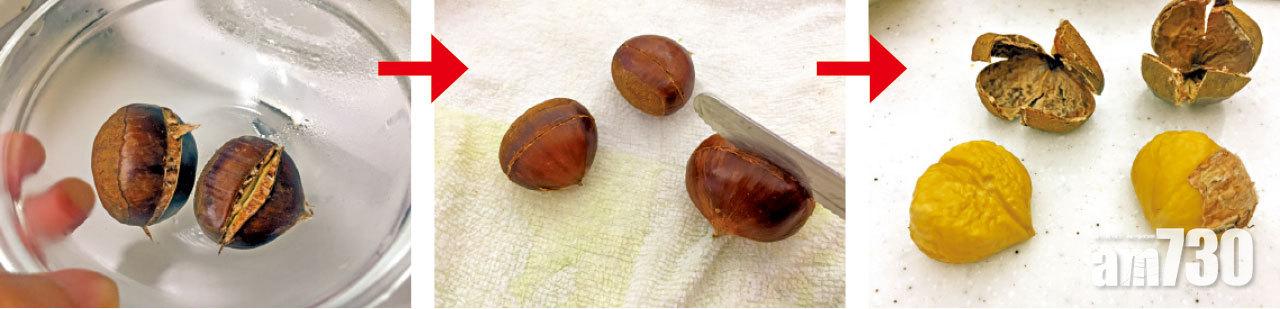 傳統水煮法:栗子放到一鍋沸水中,蓋好後熄火,任由它放到水涼,之後用刀子在栗子的底部(寬闊的那一端)劃個十字,即可連皮帶殼去除。筆者最愛用此法,皆因有效而不損栗子肉質。