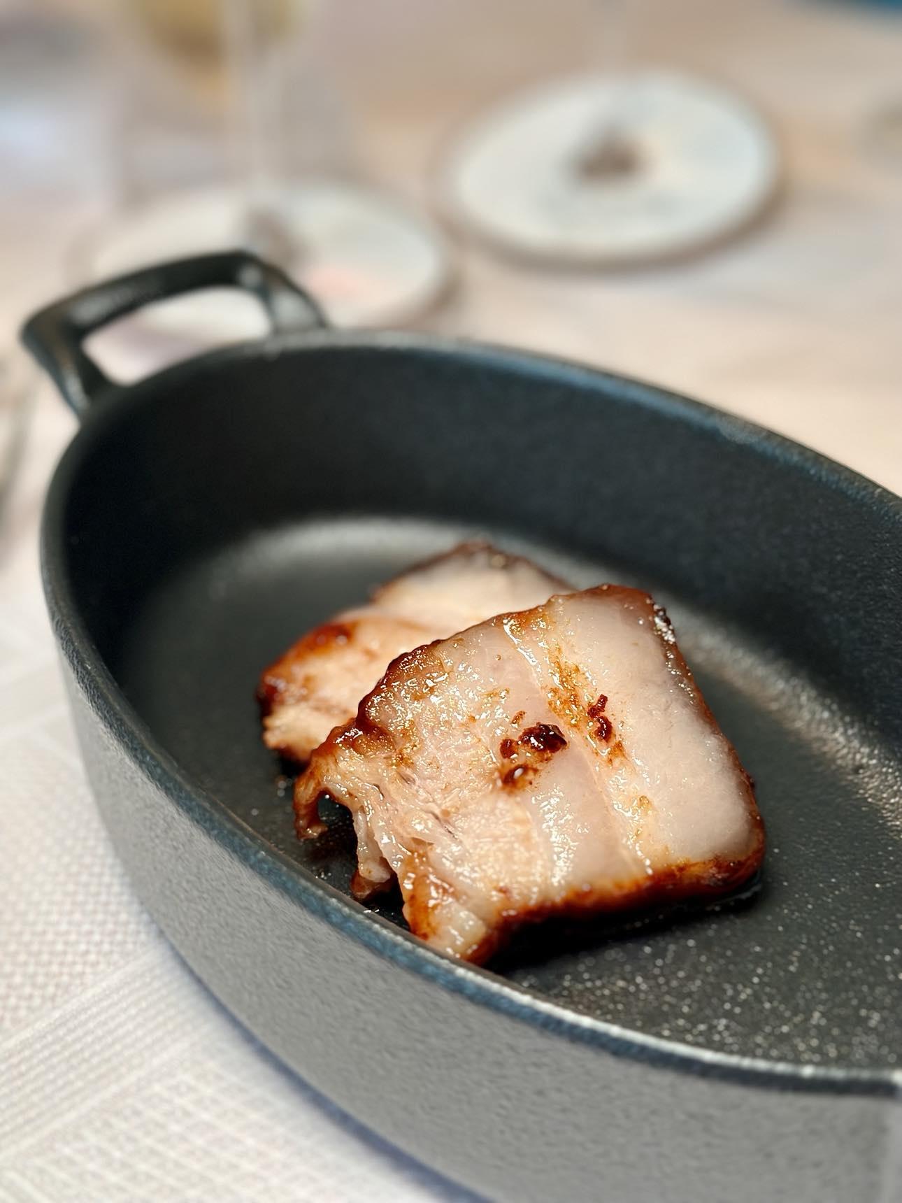 小胖肥叉─又一攞命之作。正所謂豬要食肥,五花腩肉用腐乳、玫瑰露酒醃製,烤製手法有別於廣東叉燒,外邊微酥,肥脂甘香,用來駕馭Lafite2007酒體內的單寧,遊刃有餘。
