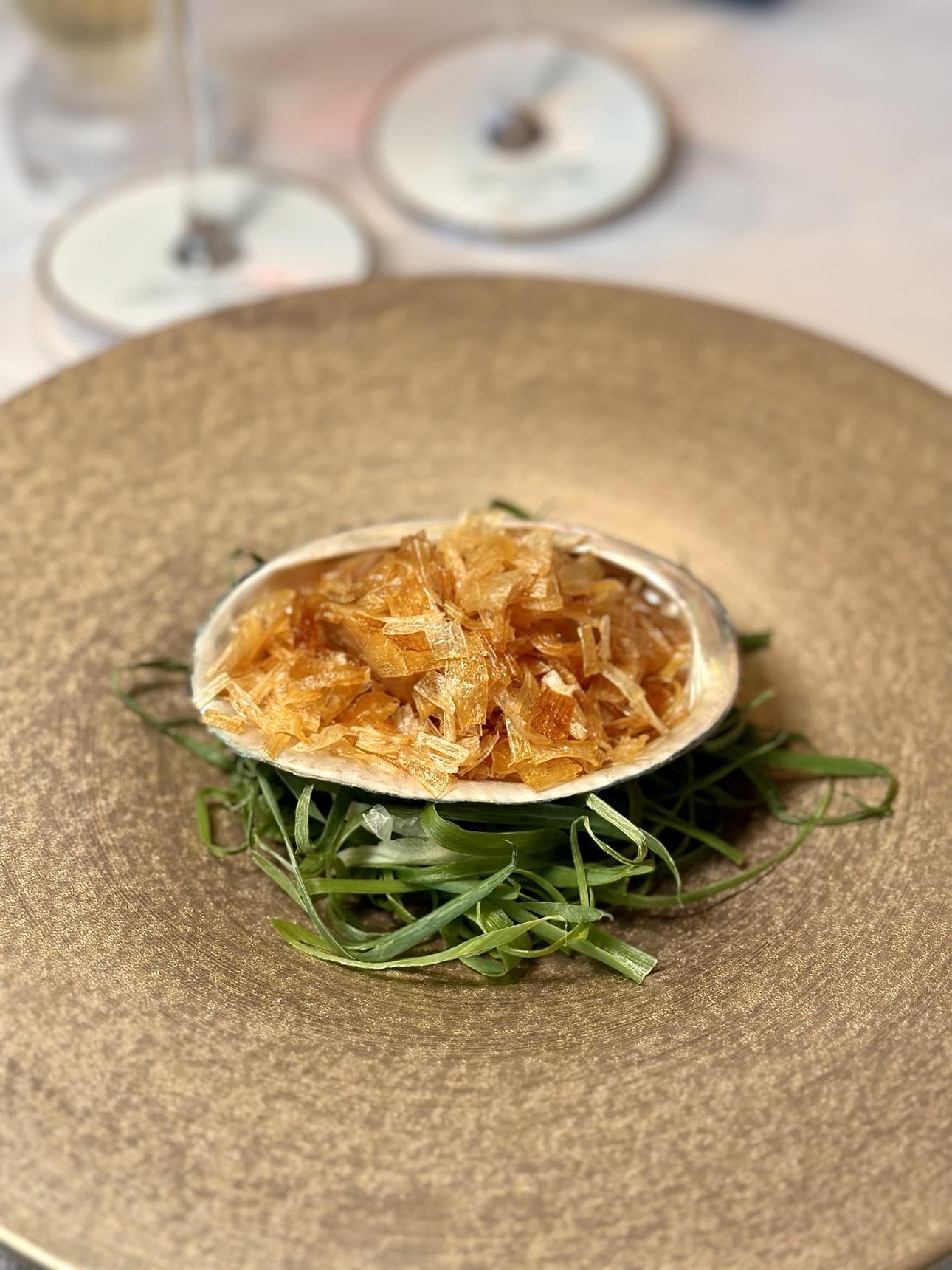 脆蔥低溫慢煮鮑魚,何謂簡單味美,這道菜示範之作。將山東章丘大蔥慢炸,鮮鮑魚低溫慢煮至軟腍,入口一脆一軟,像吃蔥油拌麵,小心吃上癮。
