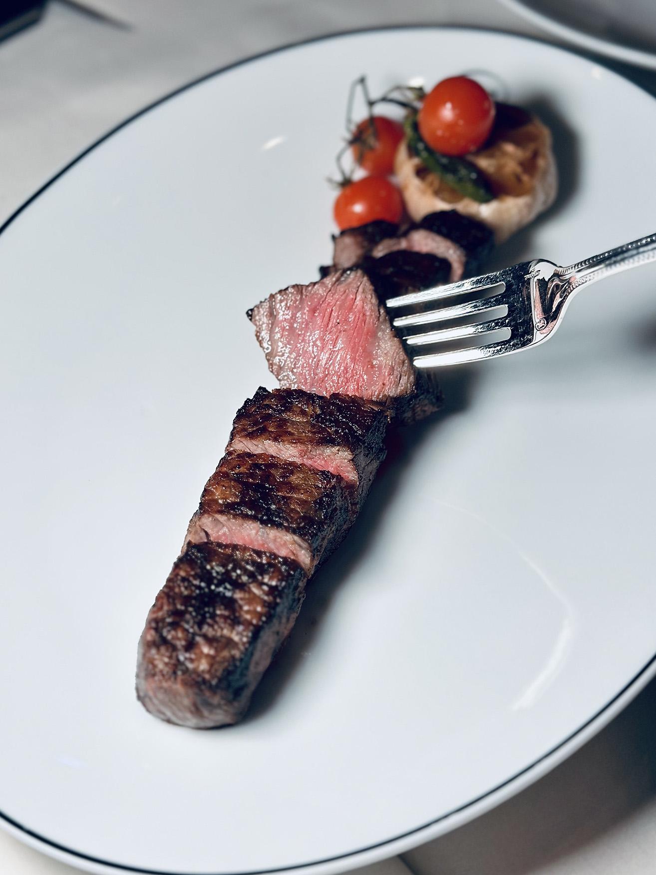 美國農業部USDA認證Super Prime級牛肉(The Steak House 獨家供應)──160日穀飼黑安格斯牛西冷,大理石油花,果味肉味俱佳。副主廚Steve Yuen控制炭火技巧爐火純青,烤至medium rare,肉香撲鼻,脂肪比例高,超juicy,而每一件牛扒rest得夠,碟底沒半點血水,對牛扒有極高要求的我打從心底裡讚嘆。