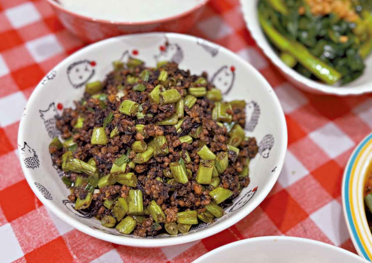 欖菜肉鬆四季豆:欖菜,或橄欖菜,乃一種潮汕醬菜,以烏欖和芥菜葉製成,鹹中帶鮮,很開胃,配飯配粥都適合。家裡常備一瓶橄欖菜,只需要一兩湯匙分量就可以做一道菜了,很划算。燒熱鑊,爆香蒜末,下免治豬肉炒至半熟,灒一些紹興酒辟腥。下欖菜拌炒均勻,下點糖使其和味,再下切成丁的四季豆或豆角,炒至豆變軟,下點麻油即可。