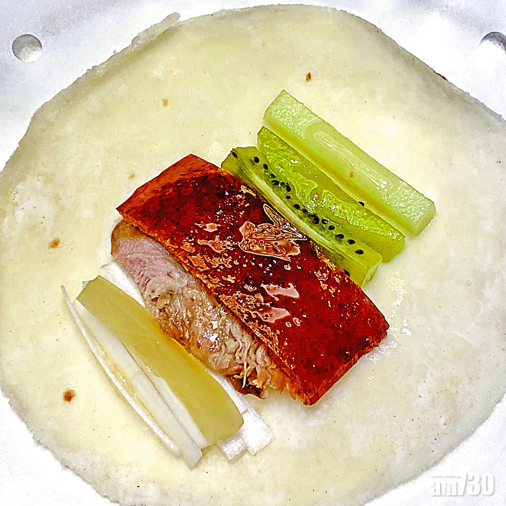 萬豪片皮鴨$888(只限晚市,需一天前預訂)──我這個鴨癡,竟然忽略了這裡的片皮鴨,幸好有心不怕遲,我敢講,Jayson的片皮鴨質素足以揮低很多名店,外皮烤得極脆入口酥香,色澤紅潤油香足,而鴨髀保留原隻上碟,可以一手拿來吃,一場鴨髀爭奪戰在所難免。配料選擇有齊砂糖、海鮮醬、檸檬汁、酸梅醬、甜酸菜、奇異果、蜜瓜與京蔥,逐樣試試發現其中的甜酸菜配搭很巧妙,酸度足以令你吃多兩件,而二食的陳皮涼瓜炒鴨殼亦誠意十足,絕不欺場。