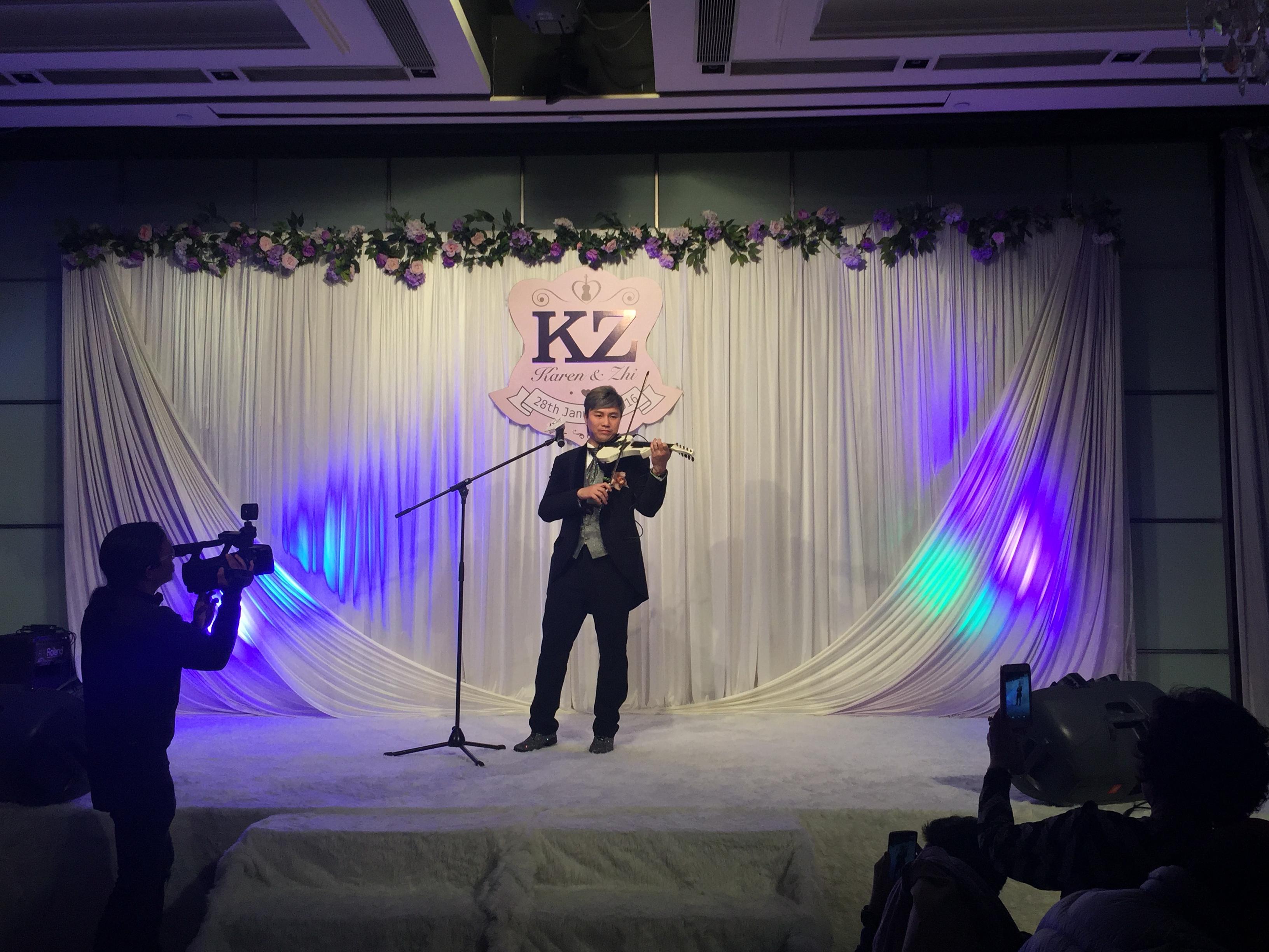 通常一對新人步入婚宴接受賓客祝福時,可能會心情緊張,但這個新郎卻是滋油淡定地拉著小提琴陪伴笑容甜美的新娘一同進場。可能平日已習慣踏上紅館或伊館的表演舞台,這晚踏上酒店的舞台便輕鬆得多,再加上全場都是家人及好友們的粉絲支持,酒席剛開始已經氣氛非常高漲!
