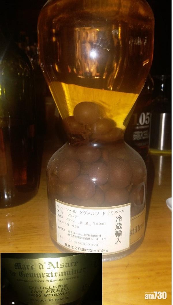 這裡的裝修擺設,非常七、八十年代,有「中道」牌子的卡式錄音座,「麥景圖」擴音機,推一對JBL的大座地喇叭,卡式錄音帶播出悠揚的音樂,酒過三杯之後,在他較為清閑之時,便在他的酒櫃裡提取了一些珍藏給我看看,今次他取出的一瓶酒,是透明的,瓶內裏有一些葡萄,細看之下,有葡萄的有酒標,原來是法國Alsace區的Gewurztraminer葡萄製造的Marc,其實即大致上是Gappa,就是用釀完葡萄酒剩下來的葡萄,來做蒸餾成為烈酒的果渣白蘭地,Alsace區有出產Marc,但瓶內藏有葡萄,我首次見到,而且這酒標古舊,相信已經放了很久,好有可能不在市面流通的,可能是一些特別版,他打算開給我試飲,但是我覺得太珍貴了,我告訴他我已有些微醺,還是留待下次才試,要試這麼的珍貴的總要提醒精神來,所以我期待下一次的東京之旅。