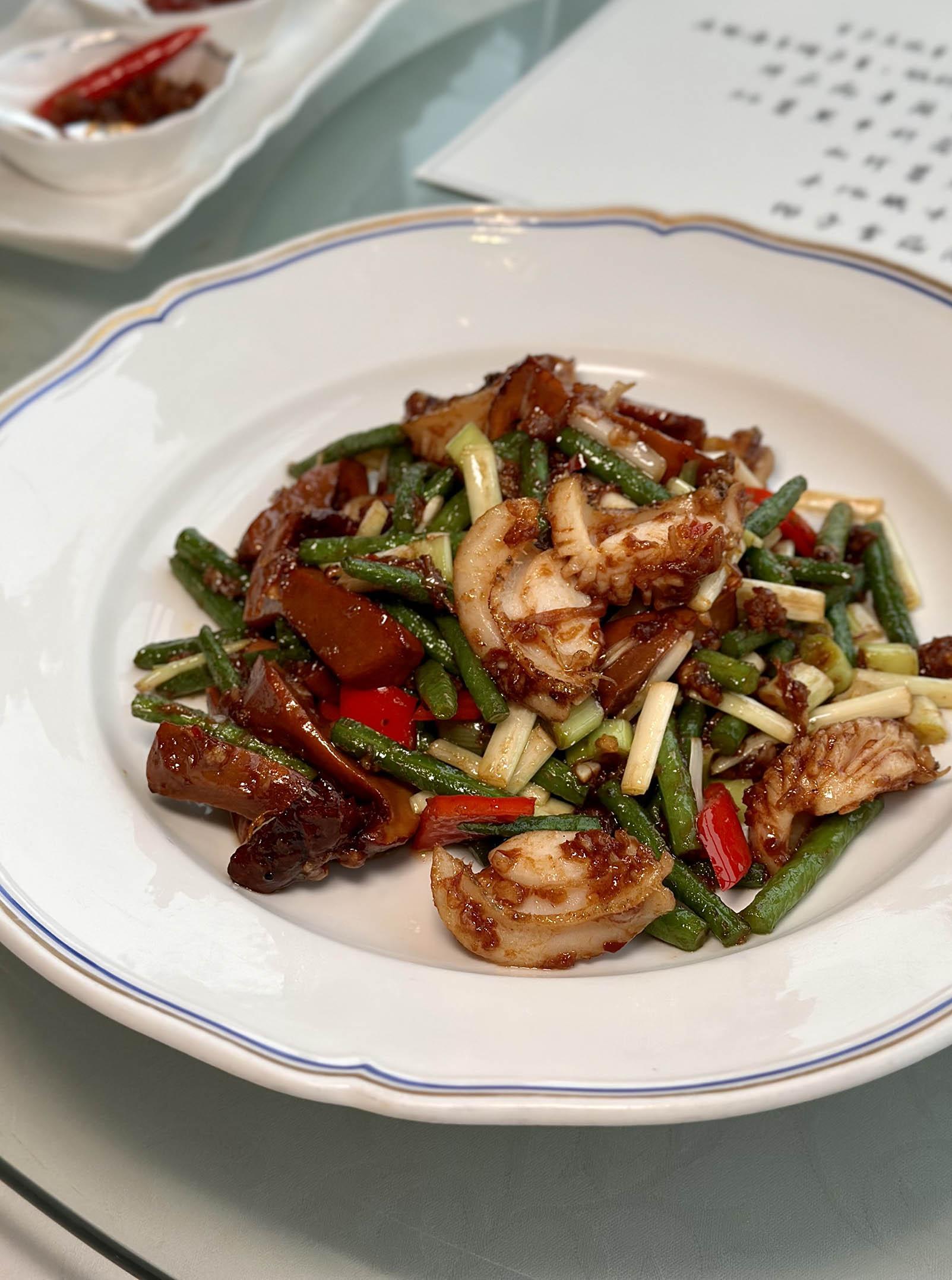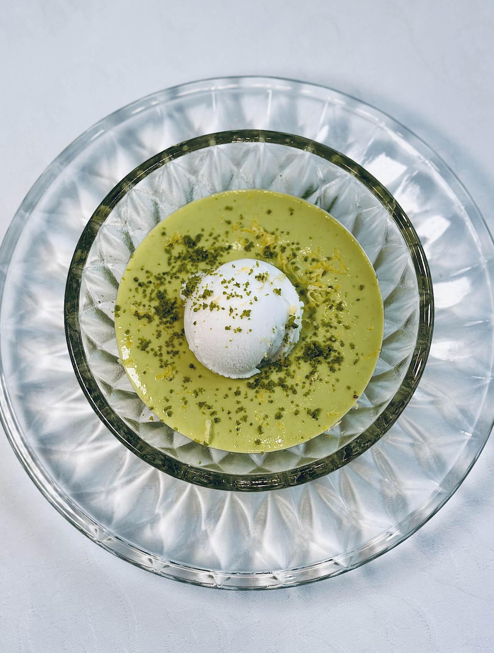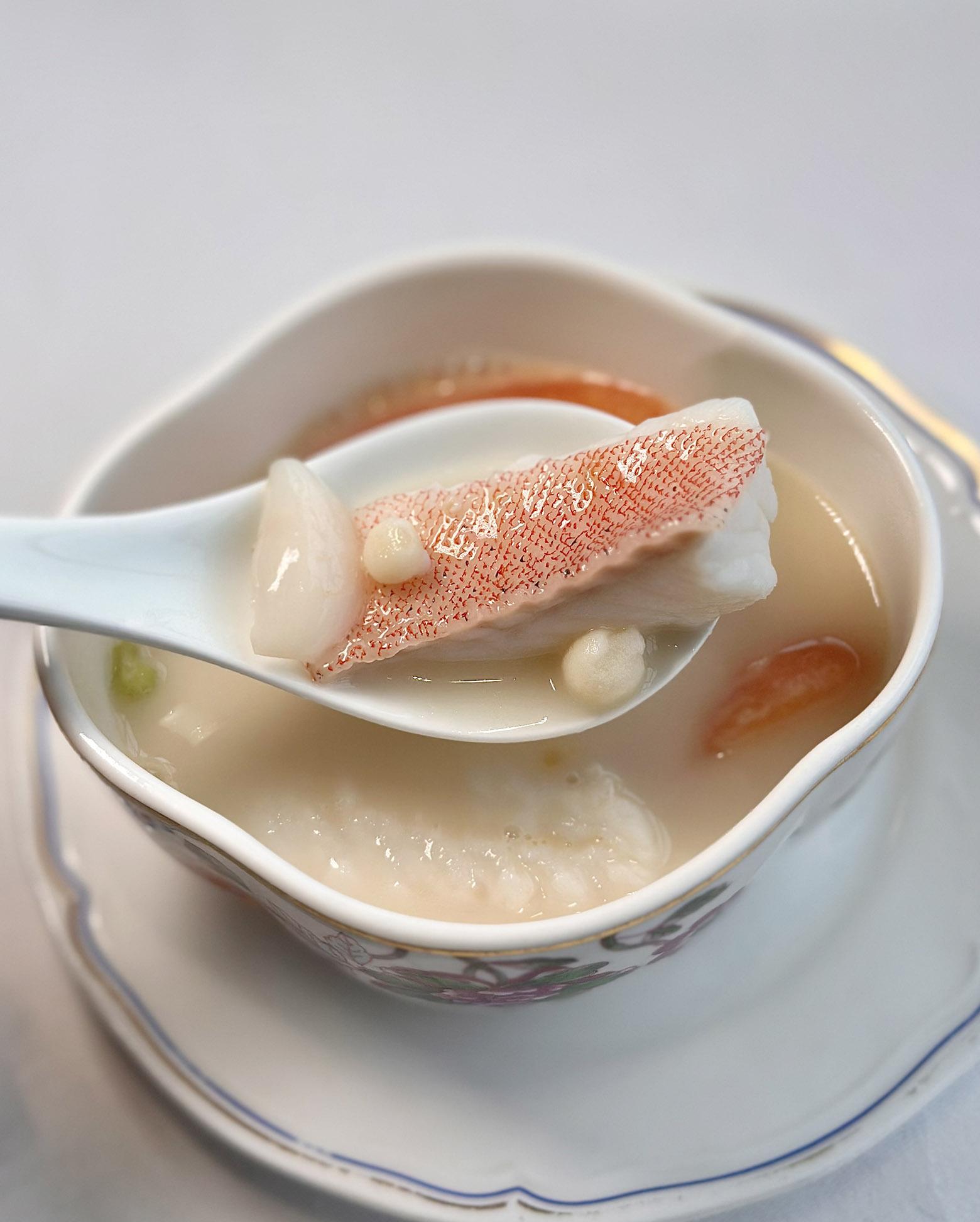 春天的濕𣲷𣲷讓人沒精打彩,只要喝一啖章哥的暖胃湯水,精神立即提振;鮮茄九年蘭州百合雞頭米斑片湯──用上本地可持續發展養殖的龍躉,斑頭腩及魚骨煎香後加水大火滾至奶白色,魚湯加入百合鮮茄雞頭米,再放龍躉片至滾熟,無比鮮甜,滋陰又養生,可以再喝一碗就好。XO醬黑牛肝菌炒澳洲翡翠鮑角──黑牛肝菌、法邊豆、鮑角用XO醬同炒,很惹味的一道菜,當中的黑牛肝菌營養豐富,能增強免疫力,極適合春天流感季節食用,章哥對食客十分貼心。山珍醬煎釀鮰魚肚──來自長江一帶嘅鮰魚肚,肚內釀入豬肉蝦肉餡,用慢火煎至大約七成熟,配上蒜蓉蔥粒山珍醬及鮑汁去煮,魚肚的膠質加上肉餡的爽彈,煎得香口,超好吃!椰子雪葩開心果露──用焗好的開心果、砂糖及魚膠攪勻成開心果露加入淡忌廉,一球椰子雪葩為開心果露提供充足的冰冷感,加上開心果碎及少許檸檬皮,香濃兼備,令人一吃腦袋會釋放多巴胺的甜品,用來收尾最開心。