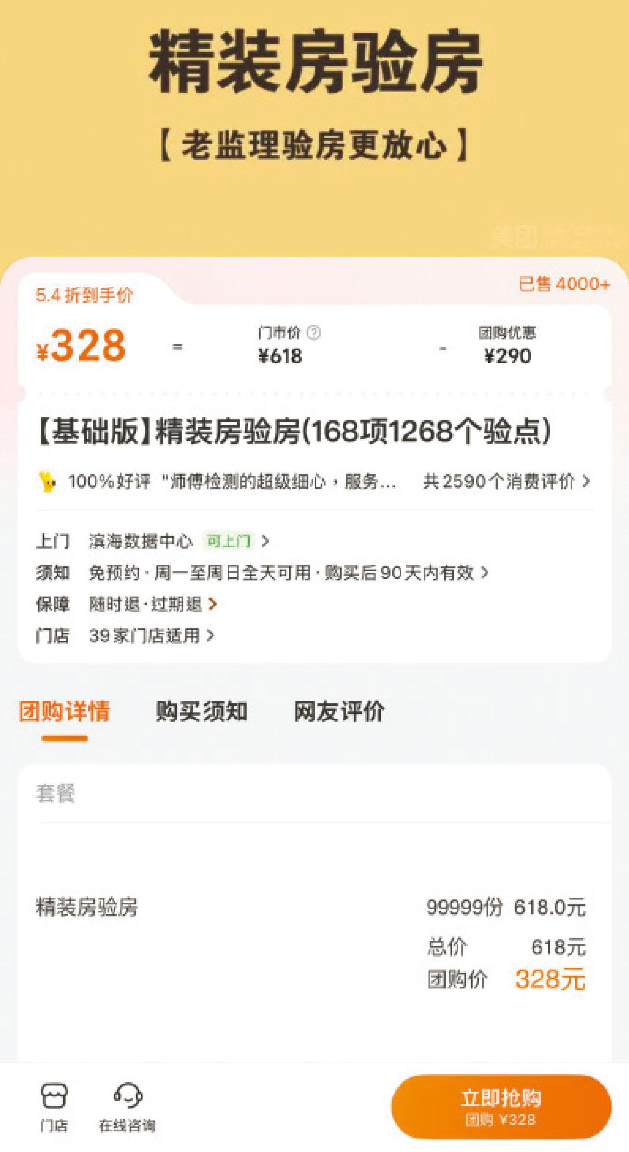 由於這個單位是精裝修,我在美團上買了一個「基礎版」精裝房驗房套餐,總共驗168項內容,100平方米以內的單位為328人民幣,即訂即有,半小時就有驗房員到門口,他帶備了十幾樣驗房的工具。