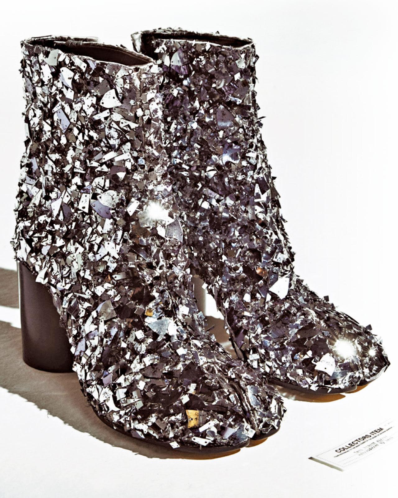 這次推出的破碎鏡面刺繡Tabi boots,將經典工藝推向全新層次。每雙鞋皆由匠人以手工繡製,耗時製作逾8,000顆玻璃珠、亮片與金屬裝飾。經雷射切割的金屬片深淺不一,組成如舊鏡碎裂般的質感。每片飾件都經獨立處理,邊緣透出細緻漸層色澤,呈現自然氧化後的光影變化;而透明玻璃珠散落其中,讓整體層次更顯立體與豐富。此限量系列全球僅25對,並將在指定專門店登場展出。