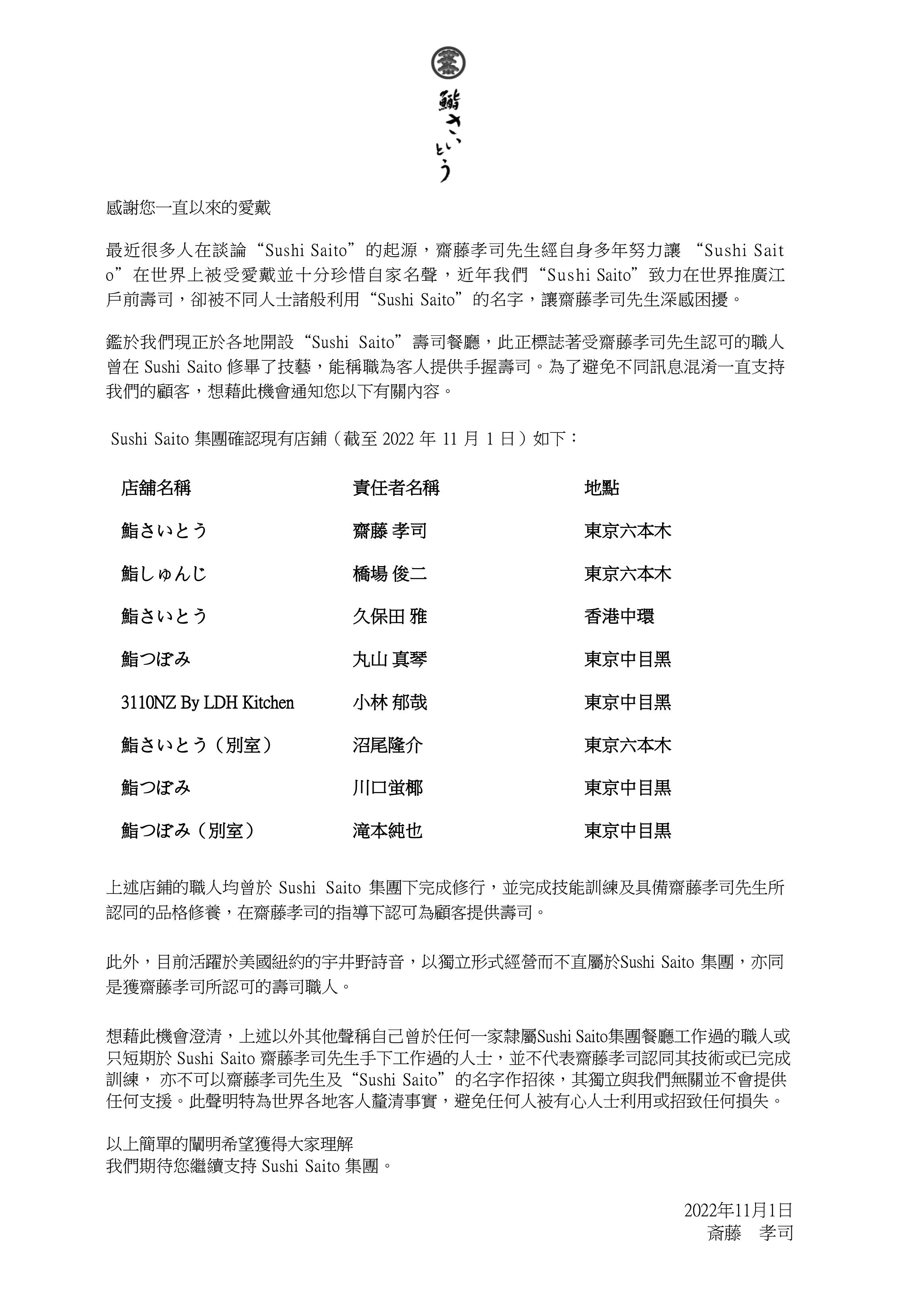 Sushi Saito發出的全球聲明。