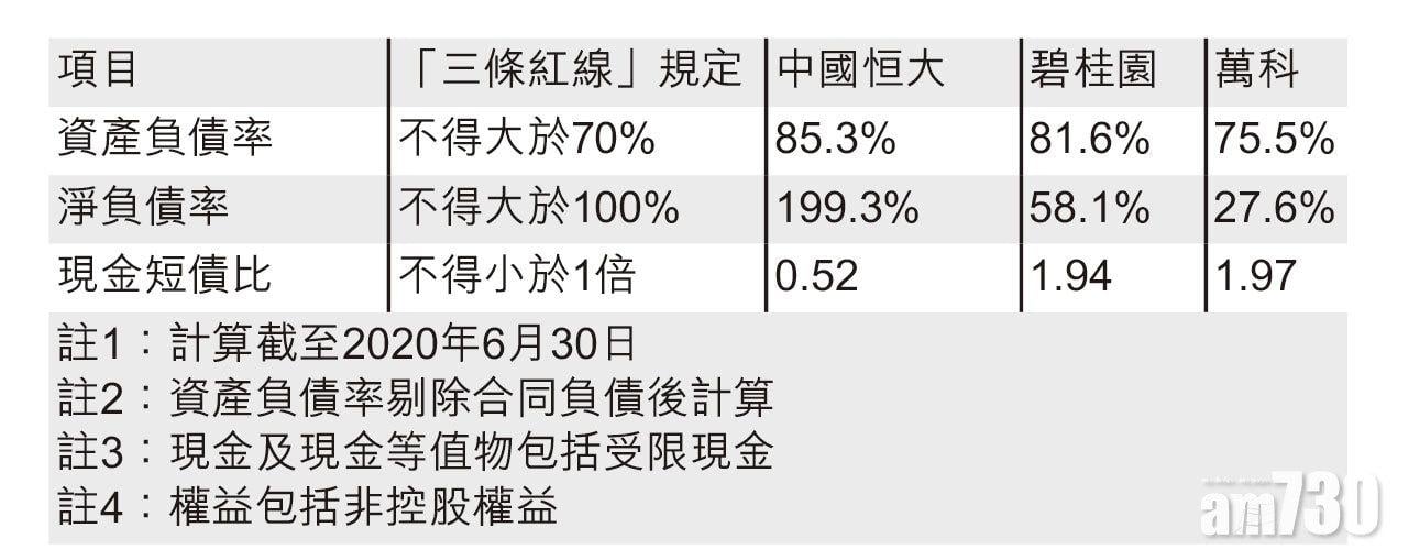 相比起來,碧桂園(2007)和萬科企業(2202)的情況就好得多(見附表),在三條紅線的規定中,只有資產負債率未能達標,但淨負債率和現金短債比非常理想,顯示這兩間企業的償付能力高,不論償還長債或短債都綽綽有餘。