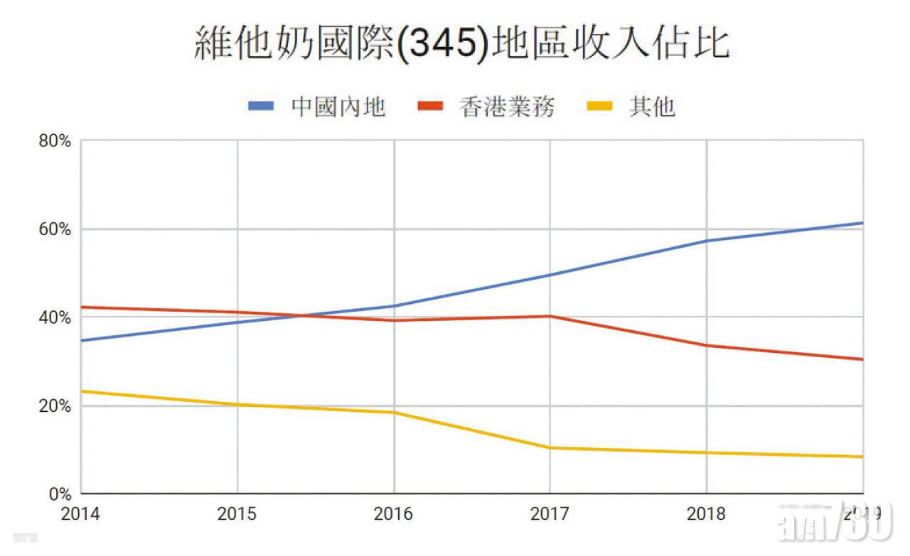 翻查維他奶的財務資料,在2015年或以前,以收入計貢獻最大的地區仍是香港,如2015年收入佔比有41%,中國內地只有39%。不過,內地業務在2016年開始追上香港,而且佔比持續擴大至目前的61%,香港只剩30%,其他地區則佔10%(見圖)。內地收入佔比擴大,主要是收入持續錄得雙位數增長所致。