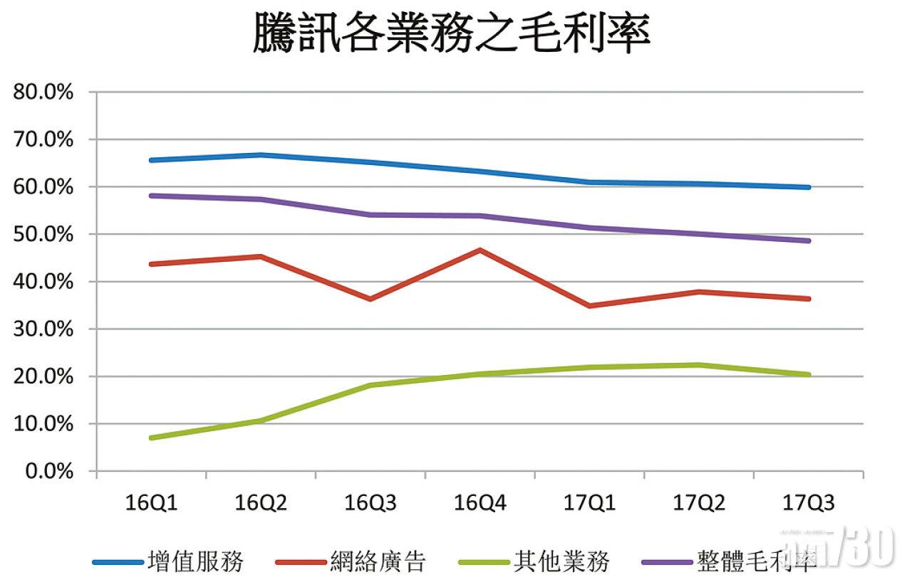 毛利率下跌主要出現在兩大業務,即增值服務和網絡廣告(見圖),如2016年第一季分別有65.6%和43.7%,到今年第三季分別跌至59.9%和36.3%。若不是具有較高毛利率的其他業務收入佔比增加,相信整體毛利率的跌幅將更大。增值服務毛利率下降主要是相關成本上升,當中包括分成、內容成本,以及智能手機遊戲渠道成本。至於網絡廣告也是因為成本上升影響毛利率,如視頻內容投資、流量獲取成本及頻寬及服務器託管費。核心業務發展至今,收入基數愈來愈大,要維持高增長就要製作更多更好的內容去吸引用戶,最後令成本上升而影響毛利率。雖然毛利率續跌,但騰訊似乎透過開支彌補損失。如今年頭9個月,銷售及市場推廣開支對收入比率減0.3個百分點至6.8%,一般及行政開支比率也減0.2個百分點至14.1%,故期內溢利率較去年同期升1.1個百分點至29.7%。更重要的是,隨著其他業務包括雲計算和支付服務的貢獻續增,如今年第三季毛利佔總毛利比率有8%,較去年同期升4個百分點。這些業務毛利率續改善,如去年第三季僅18.1%,今年第三季已升至20.3%,有助推高整體毛利率。