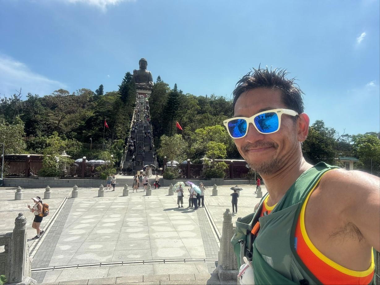 經黃龍坑道,轉右入黃龍坑郊遊徑上大東山。初段是不停的石階,好的是樹蔭,不好的是悶熱焗在林中。即使小弟以不怕熱自居,也感呼吸困難。走到半山,旁邊石塊是立體切割的方塊,山上流水而下如小瀑布,且清澈有動力。我頭立即鑽進水柱沖洗,冰涼透心。以往我兩支五百毫升,共一公升清水應可到昂平補給。但體感今天的烈陽程度,還是以保守安全為重。我一口喝掉一整樽,再灌上山水,臨行前更多喝兩口。續上走出叢林,清風吹來令人精神一振,頭頂卻要承受猛烈陽光。直走上爛頭營,小石屋在綠草山嶺上零星散佈,體感辛苦但景色真美。我開始回想要練山跑,也要享受山野。心情重拾愉悅感,放鬆速度、爽步前進。到伯公坳,又是不斷的上坡,我成功催眠心境,卻騙不過體力,這回上鳳凰山真的累。是我久疏戰陣上高山﹖還是天氣太熱﹖也許是我沒喝能量飲品和吃鹽丸﹖我一直在想,也許在昂平再決定是否繼續。終於到達山頂,再下山到昂平。寶蓮寺、天壇大佛仍然壯觀,我立即到店舖點了可樂、CC檸檬、寶礦力,我像前世沒喝水似的。稍稍休息,還是先回上鳳凰再決定是否於伯公坳撤退,吃個杯麵添水出發。