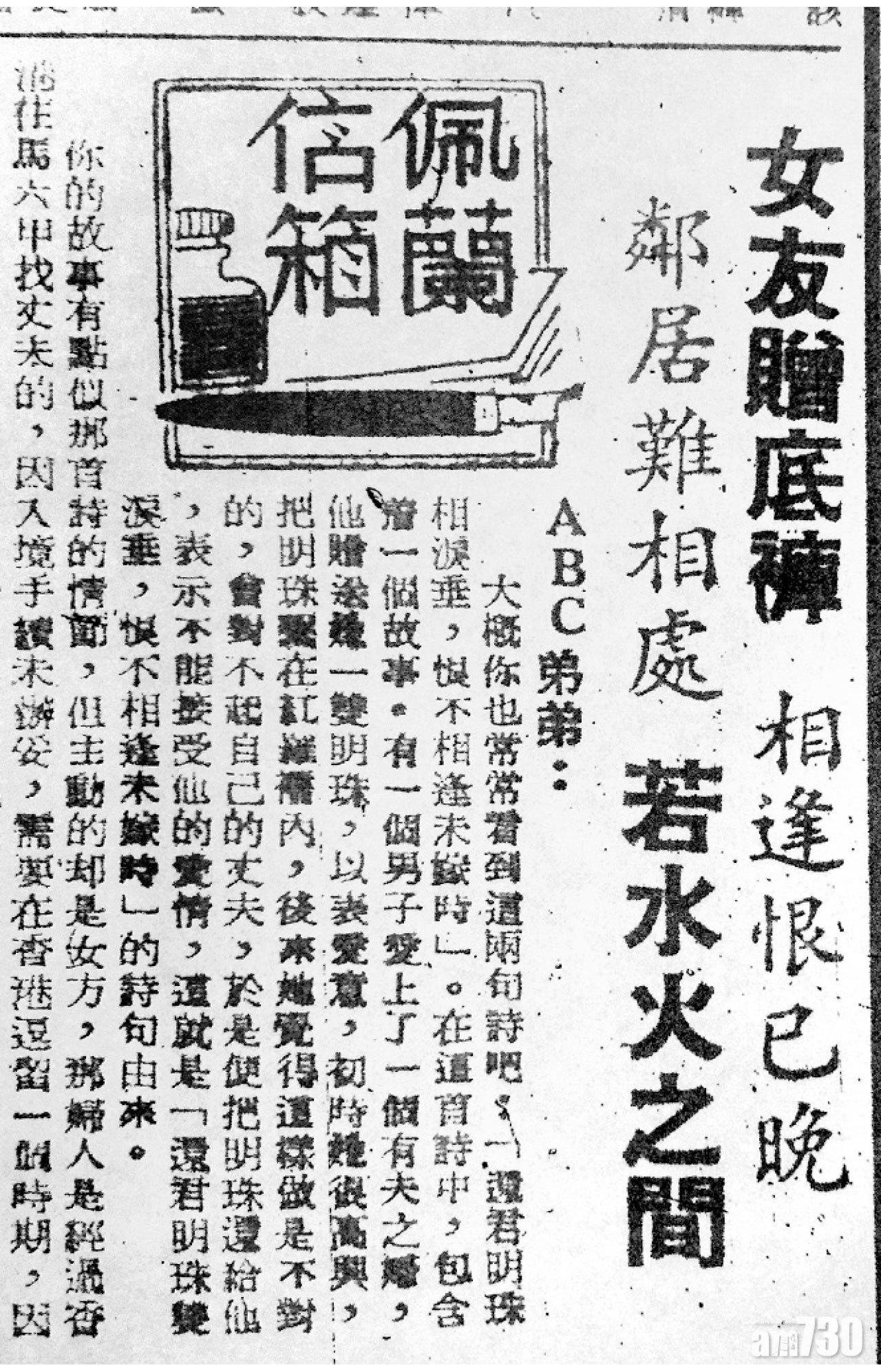 早年大多數信箱內容多帶「鹹濕」,但有時又可以當笑話看。一向以內容嚴肅見稱的左派《大公報》,其1956年8月23日的「佩蘭信箱」,竟然有「讀者」問:「有初相識的婦人暗戀我,但婦人要往馬六甲找丈夫,臨行前婦人以底褲相贈,如何是好?」信箱主持人答:「如果沒有機會把底褲還給她,就算了,但人家有丈夫,不要糾纏下去。」主持人還引詩相勸:「還君明珠相淚垂,恨不相逢未嫁時」。