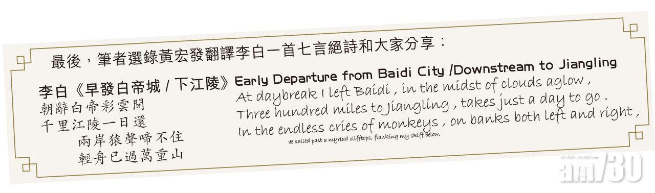 最後,筆者選錄黃宏發翻譯李白一首七言絕詩和大家分享: