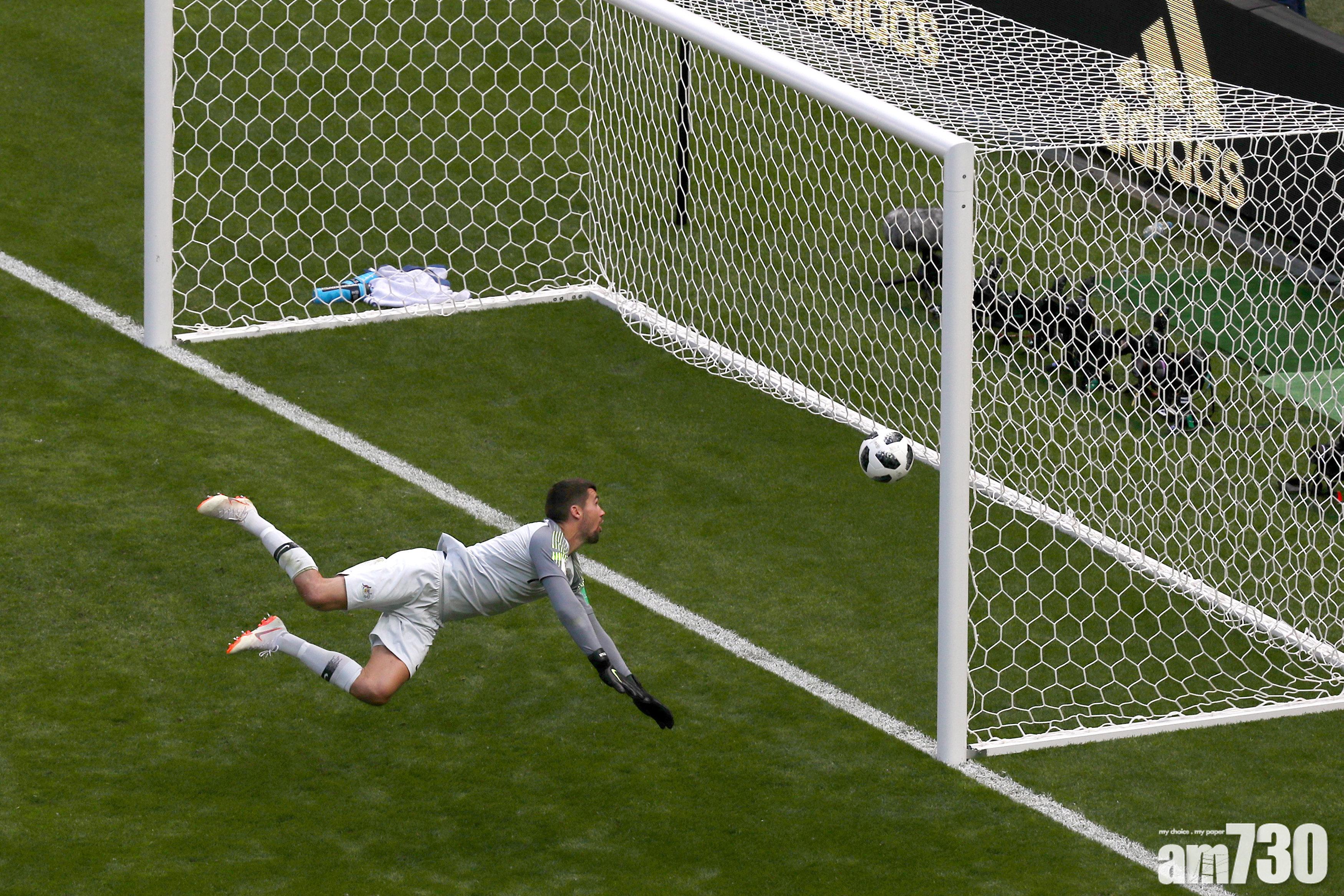皮球中楣後越過白界。(路透社)