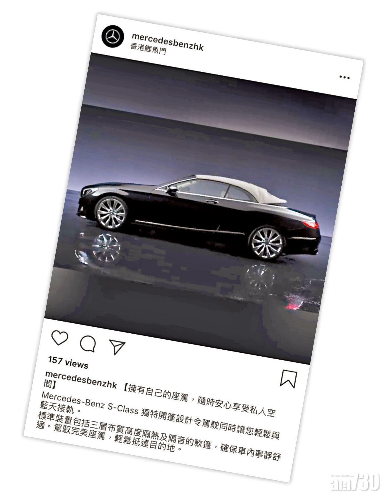 平治香港事後亦在IG發片,推銷其S-Class車系,更標明「擁有自己的座駕,隨時安心享受私人空間」,暗指出行不用搭的士之餘,更啜核在「香港鯉魚門」打卡,明處暗處都在抽水。實惠家居就沒有玩食字,就看準女事主黃心穎戴的口罩,還用「唔想傳染hurt到人」,可惜傷害已經造成。