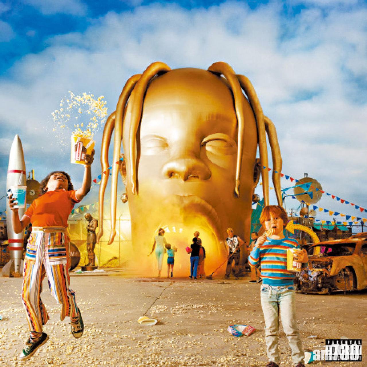 《Astroworld》專輯另一個封面設計,則有拿著飲品、糖果與爆谷的孩子們,置身於巨型的Travis Scott頭像裝置前,他希望通過這個虛擬AstroWorld,把這個象徵快樂的遊樂場,重新還給「孩子們」。