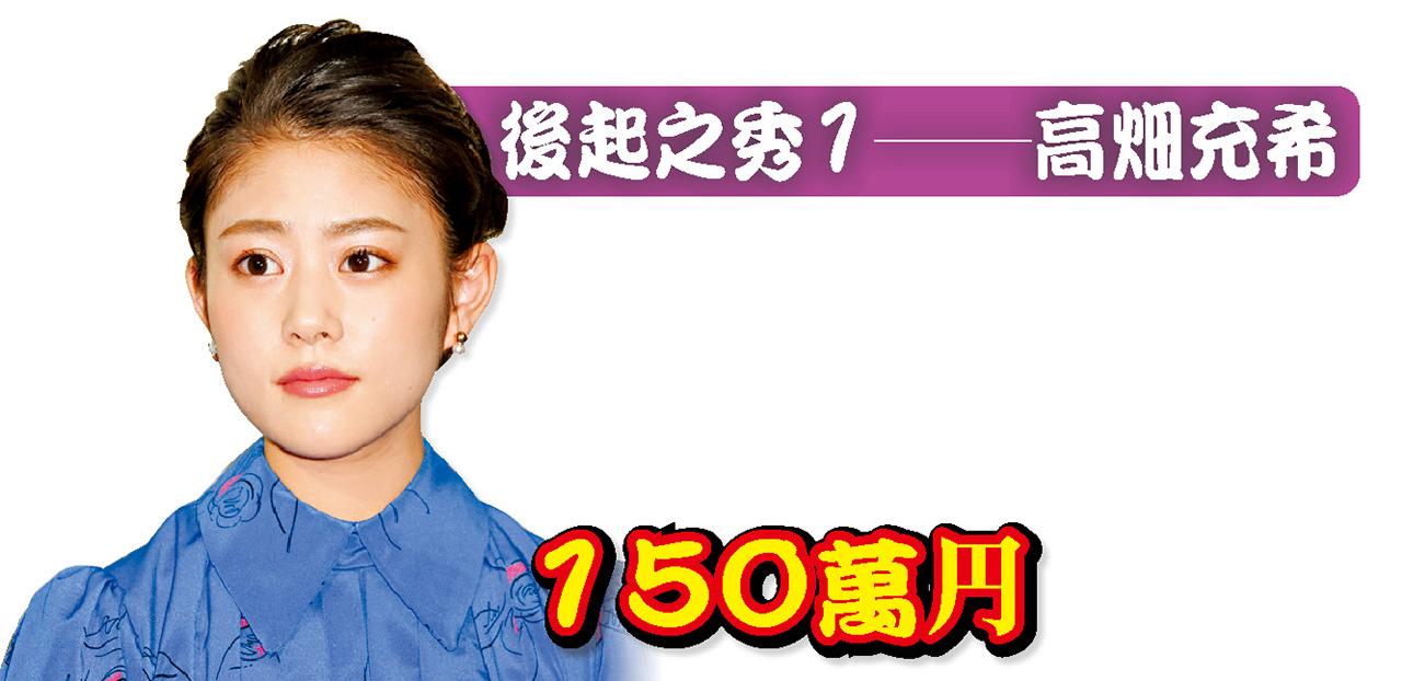 後起之秀1─高畑充希●憑晨間劇《大姐當家》上位,首集收視已達22.6%,24歲的高畑充希,當時每集酬勞是15萬円,期間廣告酬勞已達4千萬円;到今季新劇《過度保護的加穗子》,酬勞急升10倍!成為近期最被看好新進女優。