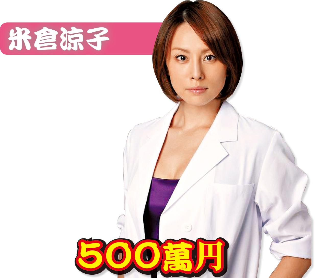米倉涼子●《Doctor-X─外科醫·大門未知子─》擔正做主角的米倉涼子,去年第三季一出,收視超越20%,比城中熱話《逃避可恥但有效》高出接近一倍;米倉涼子每集酬金更升至555萬円(約39萬港元)!日劇史上絕對前無古人,加上DVD或網上版權費等,每集起碼賺1,000萬円!