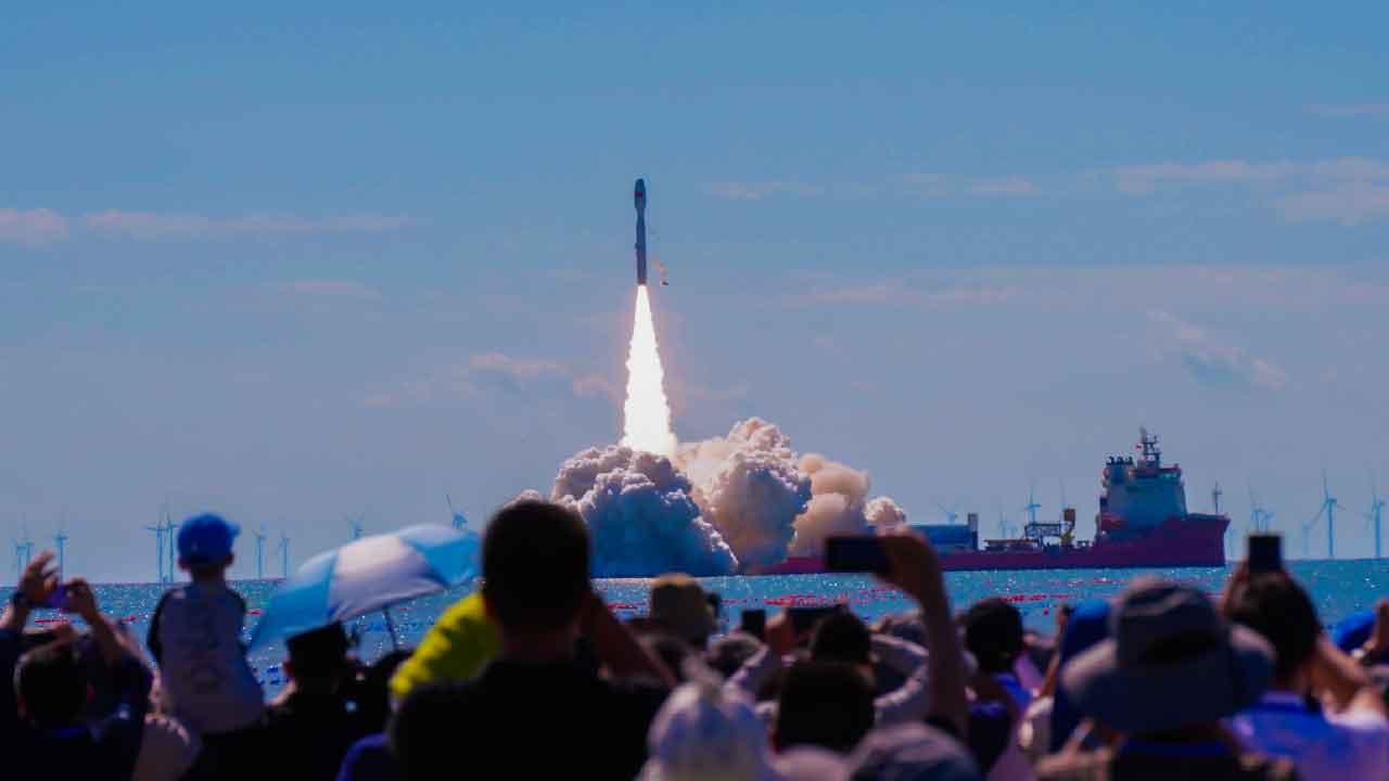 遊客在山東省海陽市附近海濱觀看火箭發射。(新華社)