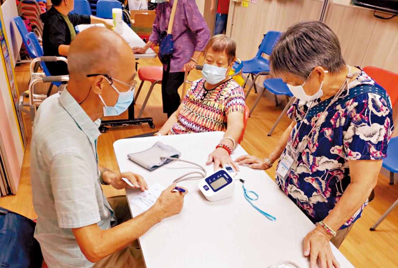 章先生每周於健康檢查站,協助長者進行簡單的身體檢查。