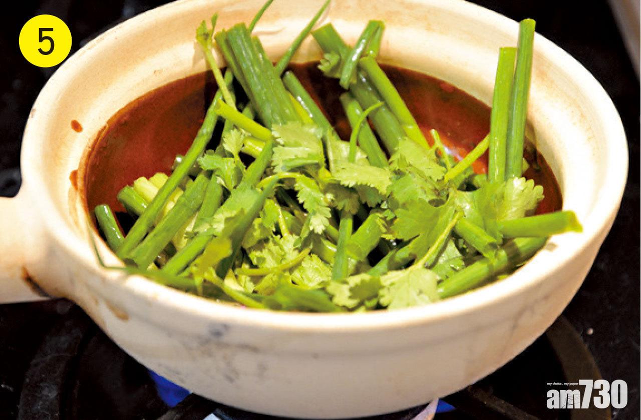 5.燒熱瓦鍋,把葱段和芫荽舖在鍋底,放入雞件和豬膶,沿鍋邊灒入紹興酒,看到鍋邊冒煙及聽「吱吱」聲,蓋上鍋蓋煮1分鐘,熄火焗2分鐘即成。