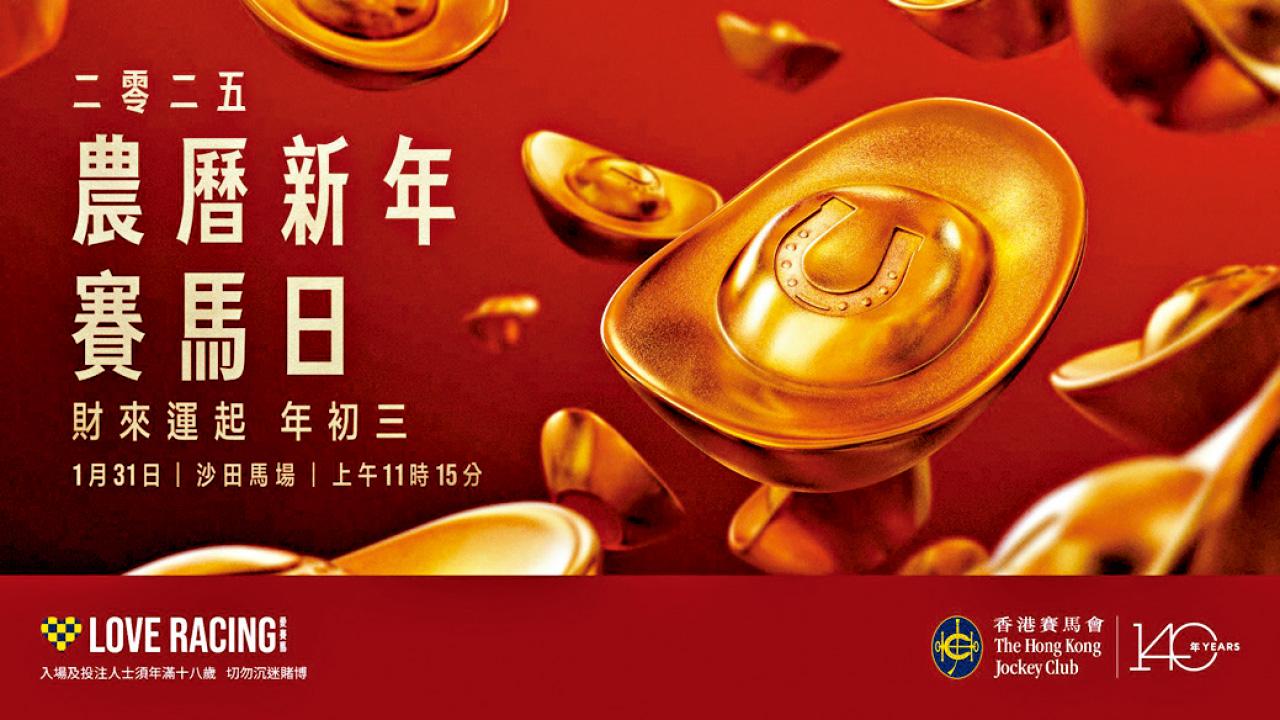 香港賽馬會一年一度的「農曆新年賽馬日」將於大年初三(1月31日)在沙田馬場舉行。除了參與賽事,還能享受一系列節慶活動和豐富獎賞。當天下午3時30分前入場的觀眾可免費領取「財來運起風車筆」,並參加「沙田馬場日日賞呈獻農曆新年大抽獎」,有機會贏取足金或鍍金擺件,3名大獎得主更可獲得足金金元寶。
