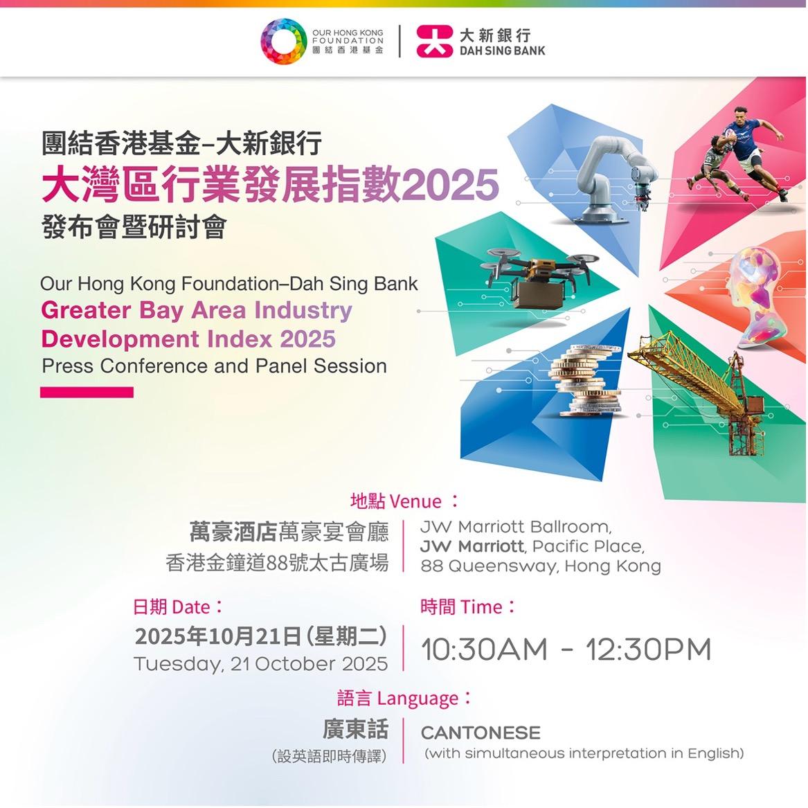 團結香港基金及大新銀行有限公司將於2025年10月21日聯合發布《團結香港基金–大新銀行大灣區行業發展指數2025》(圖片來源:團結香港基金)
