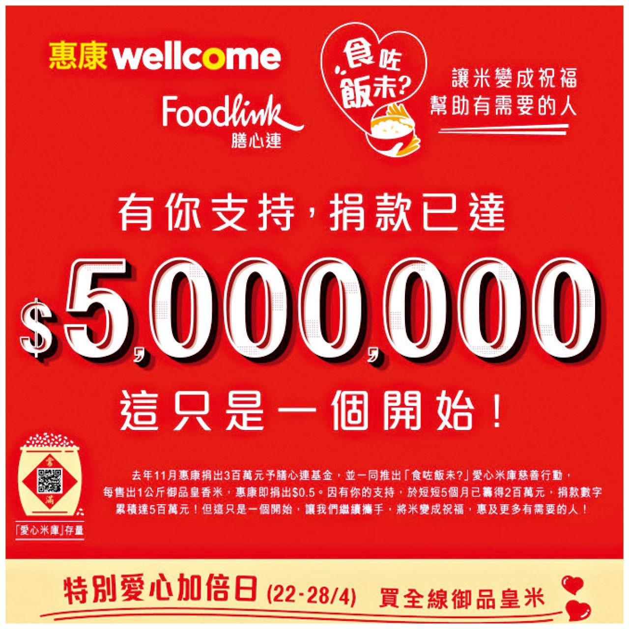 其實達到500萬元善款目標無疑是莫大的鼓舞,但這只是一個開始。反應好,惠康亦將愛心加碼。除每月第一天的「愛心加倍日」,由今日4月22日起至28日,一連7日,惠康更發起「特別愛心加倍日」,即顧客每購買1公斤御品皇香米,惠康便會加碼一倍,捐出1元,更額外送出御品皇頂級泰國茉莉香米500克一包,以答謝顧客支持,同時令更多基層市民受惠。