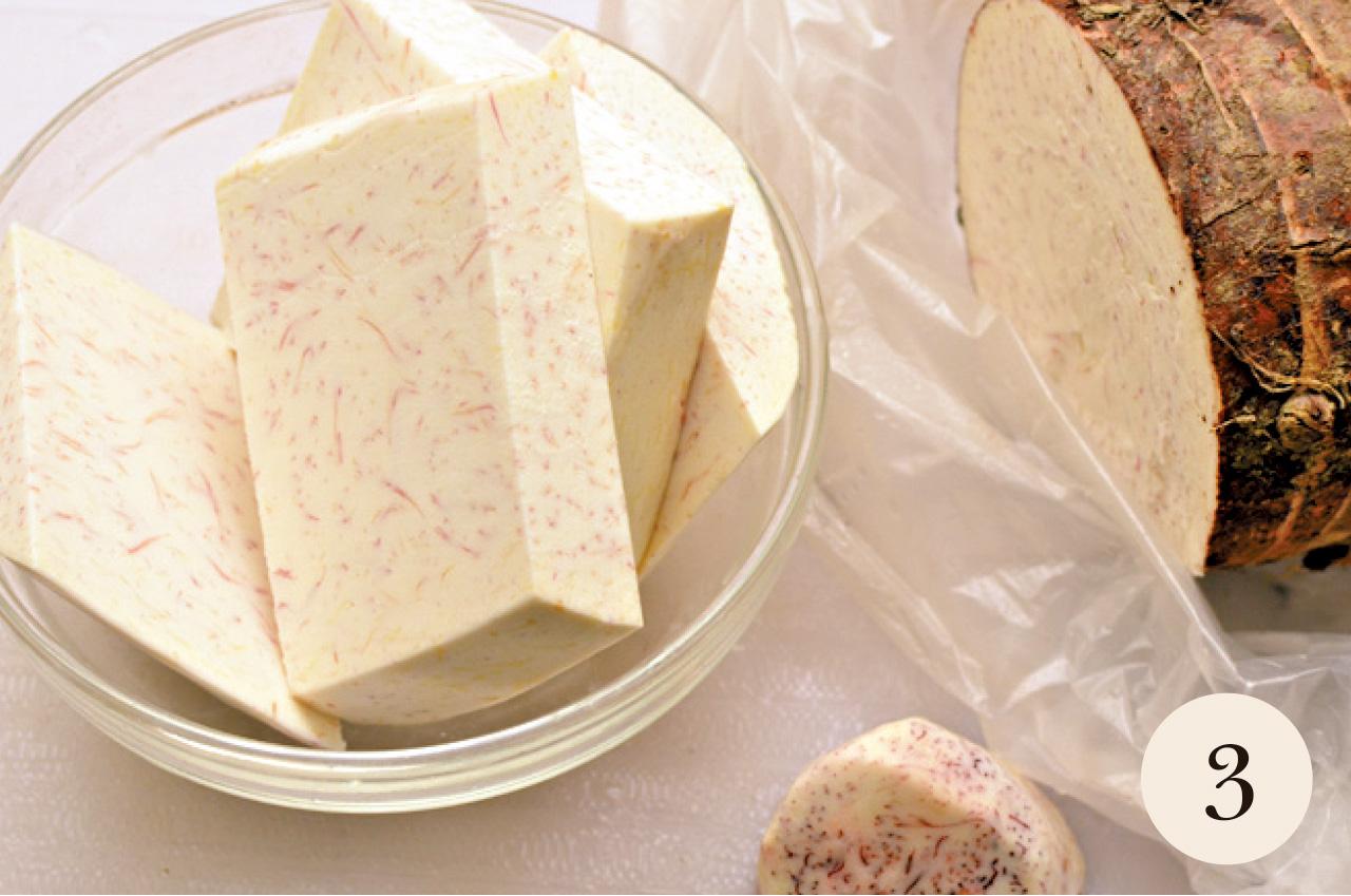 3.芋頭去皮切件,半煎炸至微黃,備用。