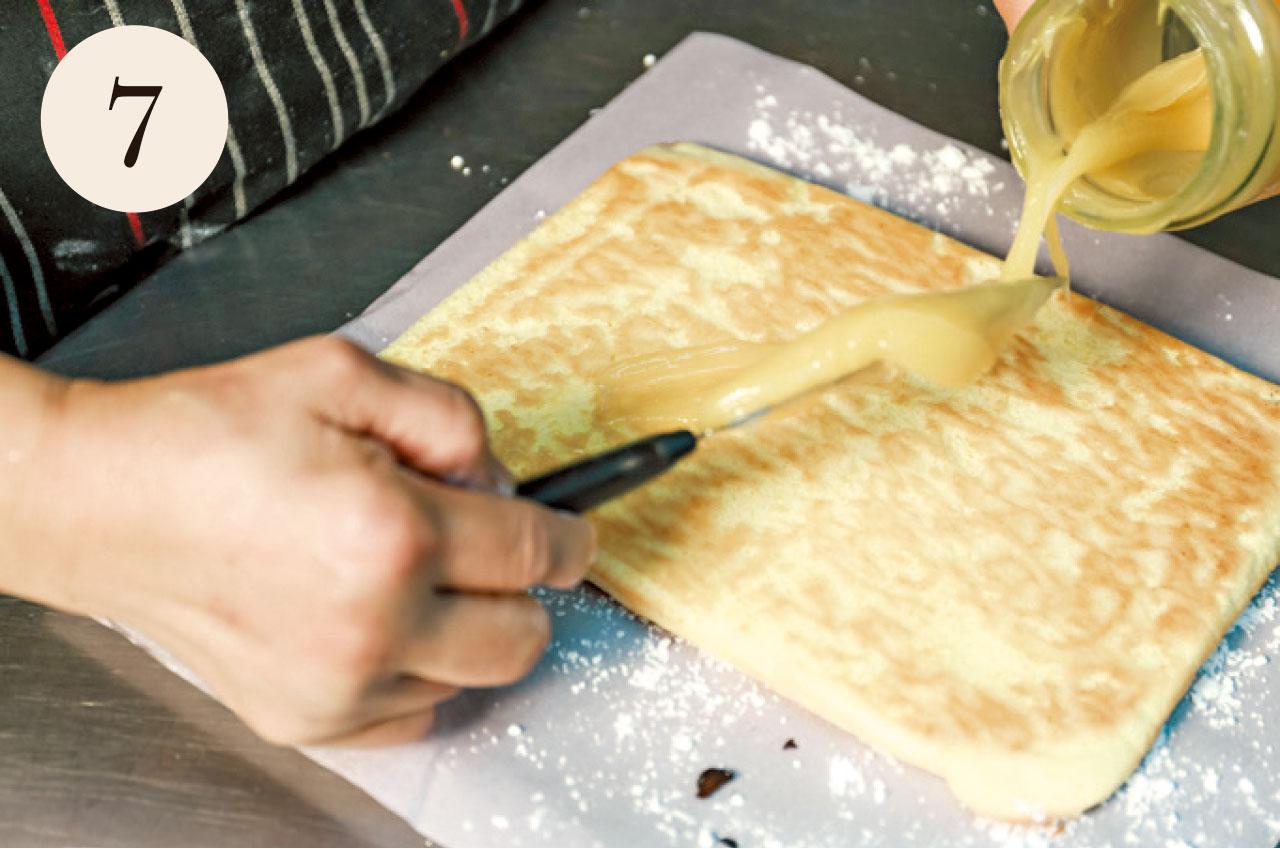 6.預備多一張牛油紙,灑上少許糖霜,將蛋糕反覆於其上沾抹。