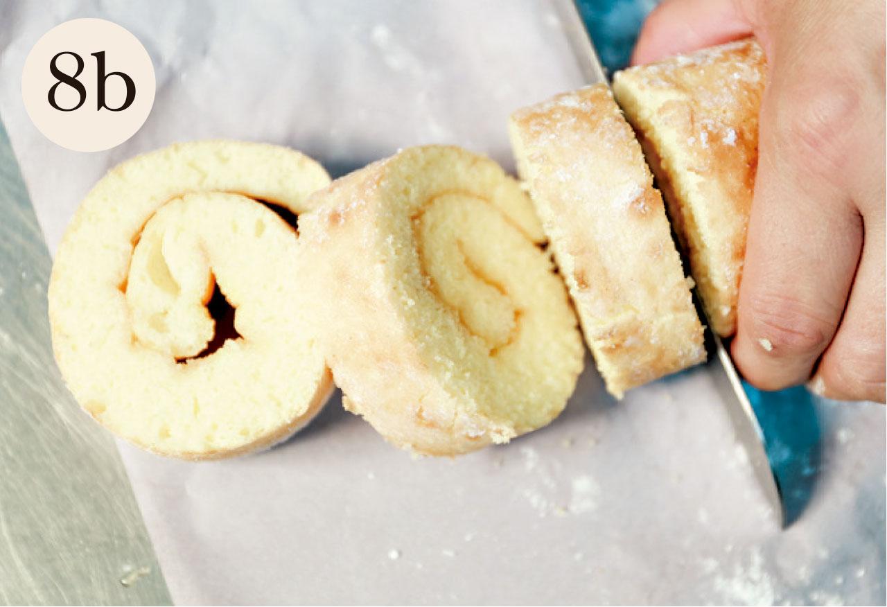 7.(*)在蛋糕的一邊輕輕切兩刀,再抹上檸檬乳果醬。