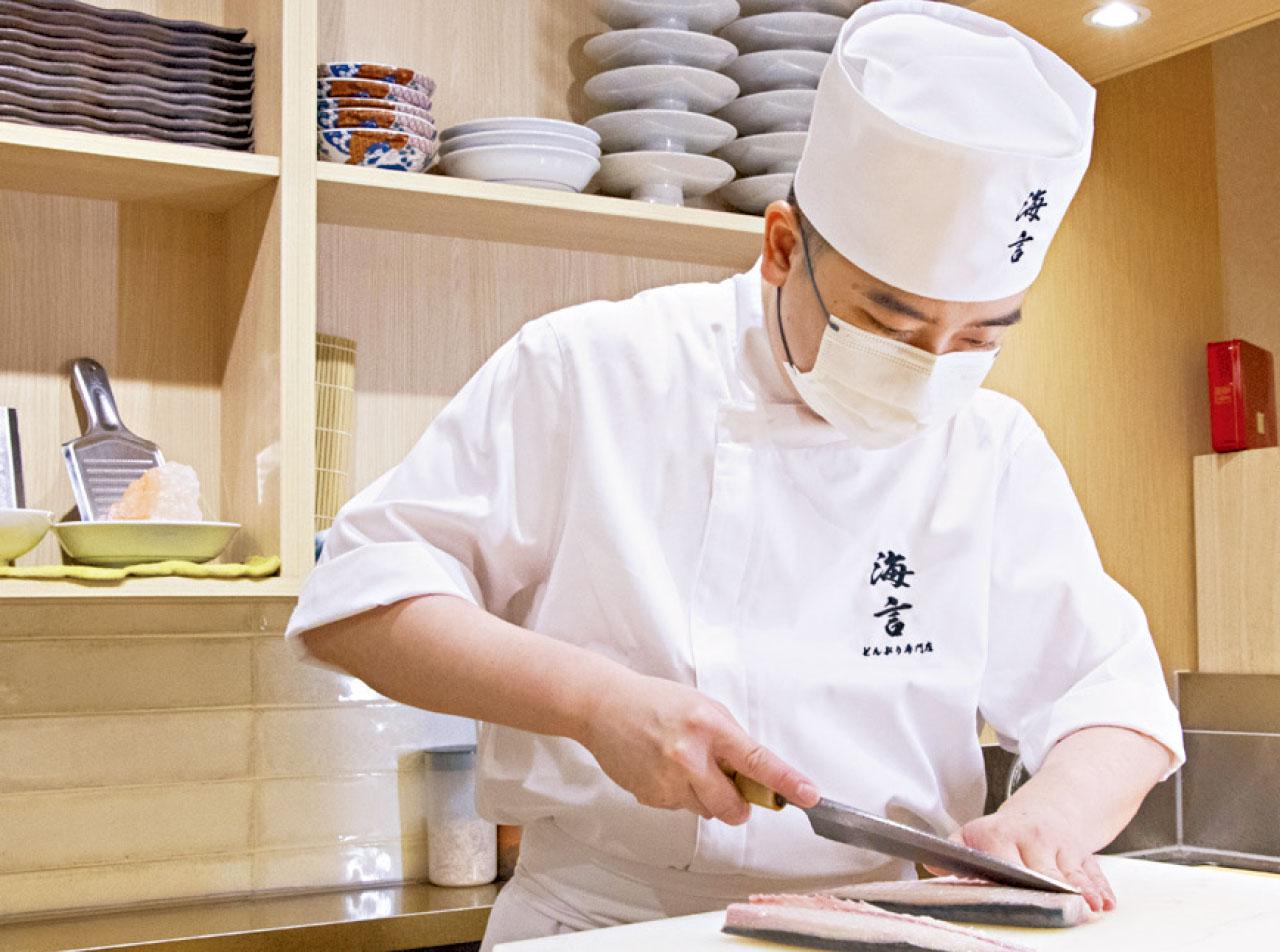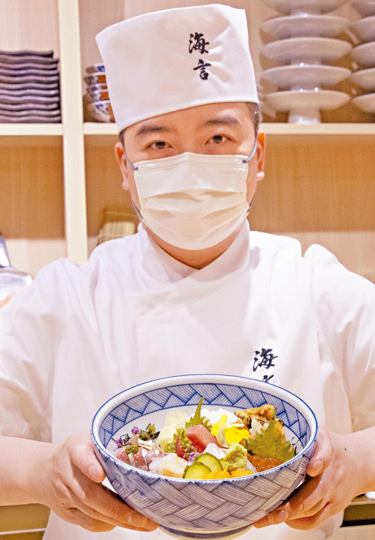 言師傅出身自香港一代壽司名店見城,亦曾在元朗開設「壽司之神」及「壽司源」,本地薑名氣夠熟客又有,今次落戶中環,一碗廚師發辦魚生飯就爆紅,預約媲美日本師傅坐鎮的壽司名店。海言賣的是「丼飯」,如果你去過日本的丼飯專門店,隨隨便便都有數十款不同的選擇,海言的丼飯選擇實在少得多,最受歡迎的就是其不用「選擇」的廚師發辦魚生飯,內裡有足足15款師傅因應季節所選的時令刺身,免卻大家有選擇困難症。問道言師傅為何捨壽司而改做丼飯,說道:「做丼飯成本比壽司低一點,魚生厚度不同,飯也不用分多次煮,可用更親民價讓人吃到江戶前的味道。」