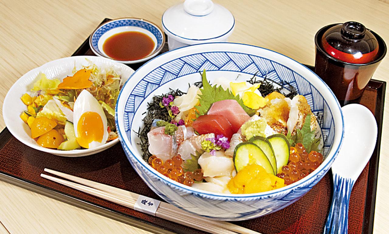 海言廚師發辦魚生飯(特上)$380─採訪當日魚生飯上有甜蝦、海鰻、燒大拖羅、中拖羅、赤身、春子鯛、赤睦、海膽、三文魚子、鰤魚、深海池魚、帆立貝、新鮮北寄貝、鯖魚及池魚等。師傅提醒大家由白身及光身魚吃起。