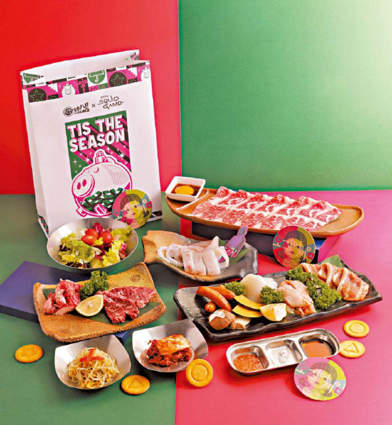 「紅綠燈魷魚遊戲套餐」靈感來自劇中的第一個關卡123紅綠燈,有新鮮魚、醬油五花肉、梨汁雞肉、深海鱈魚肉、韓式香腸等,只需$758就可以飽到捧腹,隨餐附送魷魚遊戲貼紙。