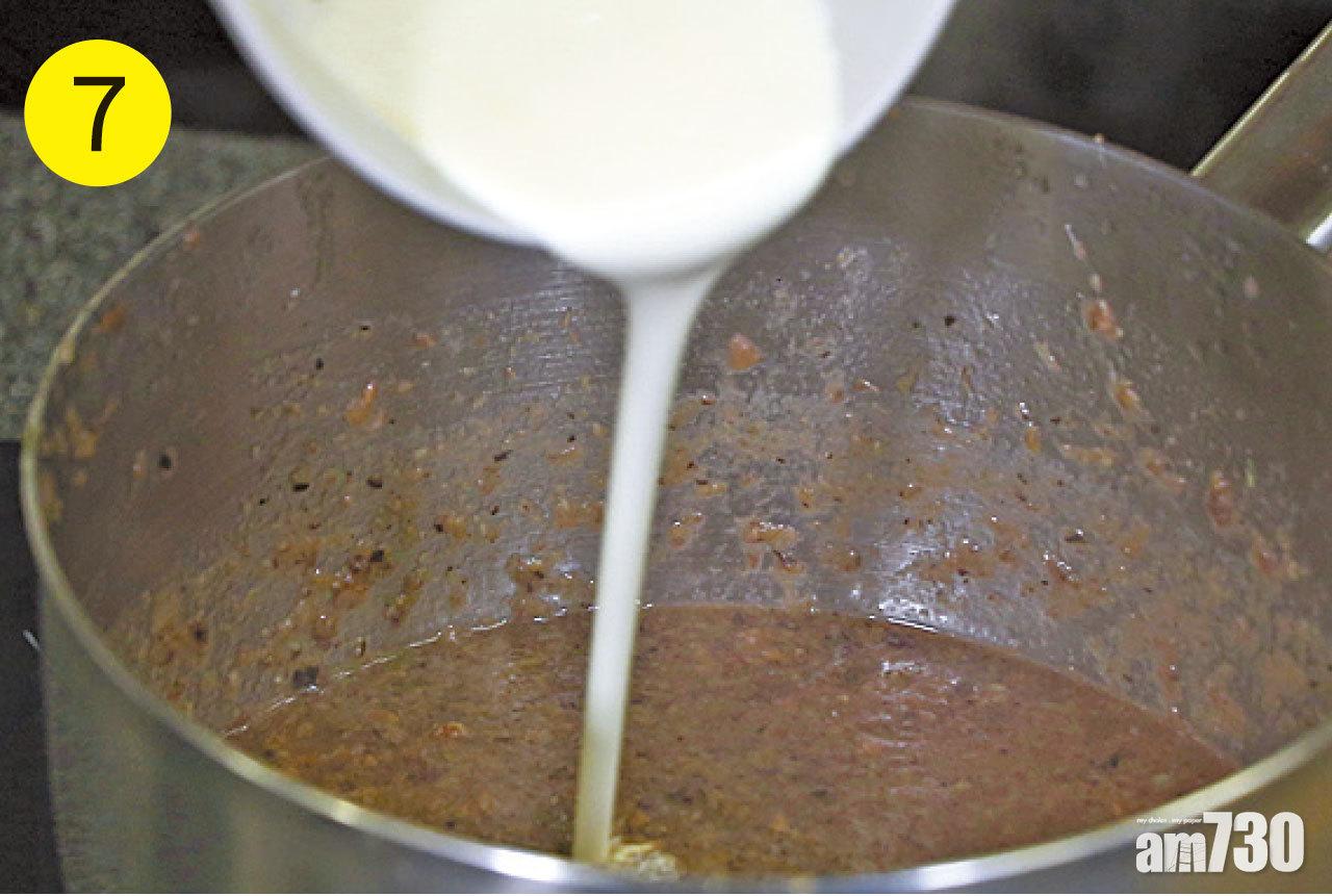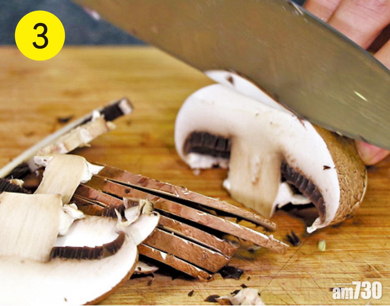 4-5. 中火加煮溶牛油,加入洋蔥以慢火煮至軟身,加入蘑菇,炒至金黃。加入紅酒,煮至揮發。