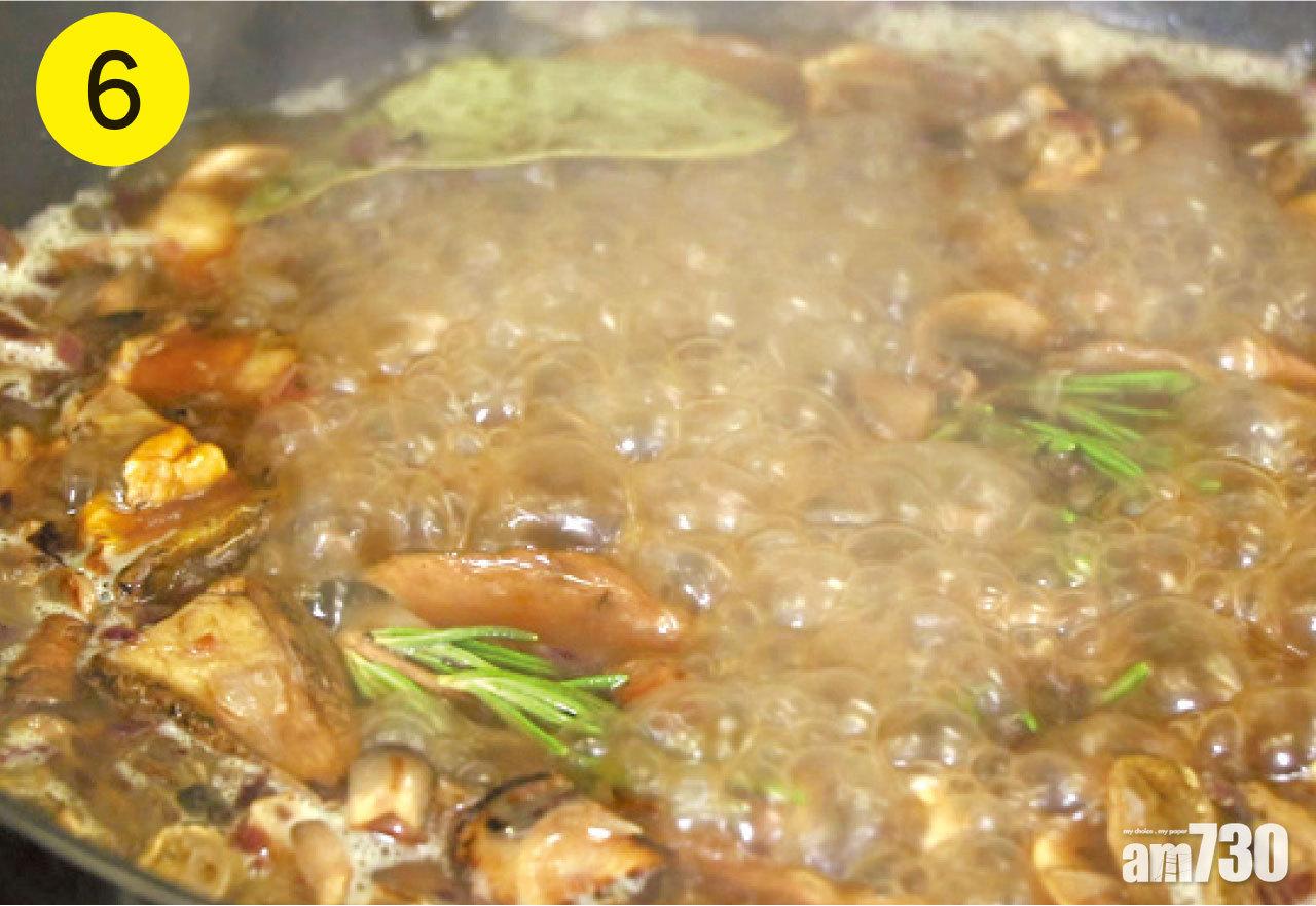 6.加入牛肝菌及浸菌水,煮至剩下一半水分。加入月桂葉及迷迭香,加入菜湯煮沸。撈起部分牛肝菌,扔掉月桂葉及迷迭香。