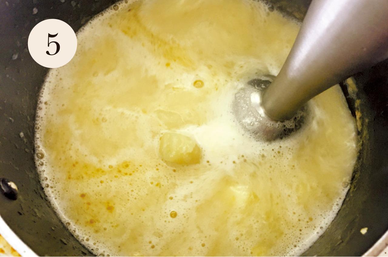 5.以手提攪拌器(hand blender)將煮好了的白蘆筍、洋蔥及雞湯攪拌至綿滑。注入鮮忌廉,加入肉荳蔻粉,拌勻。試味,有需要才下鹽。