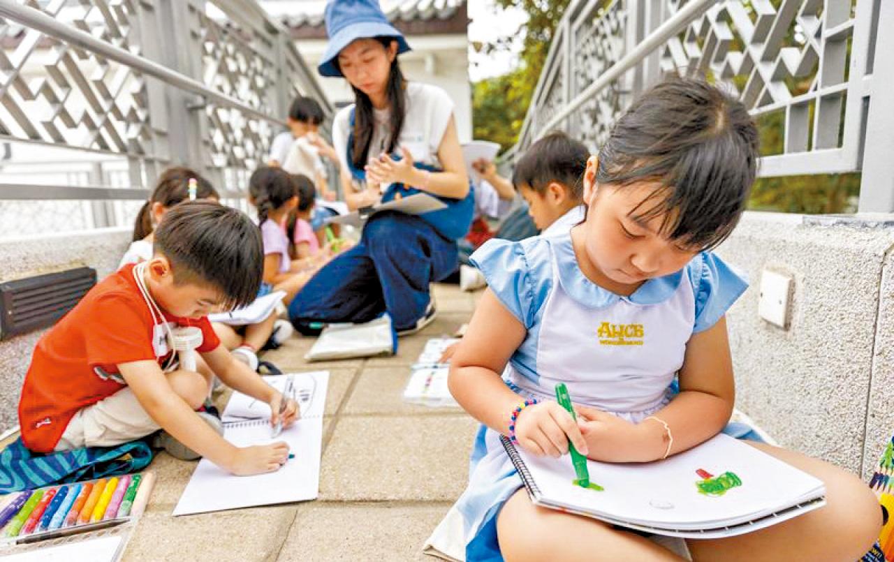 小朋友除了乘坐纜車俯瞰自然風光,更遊覽市集,欣賞各類傳統手工藝品,從中吸取創作靈感,隨後在繪畫導師的引領以及葛民輝的陪同下揮筆作畫。