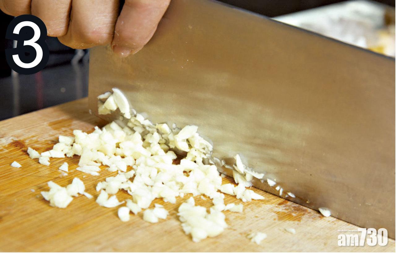 2-3. 欖角切碎;蒜頭切粒。
