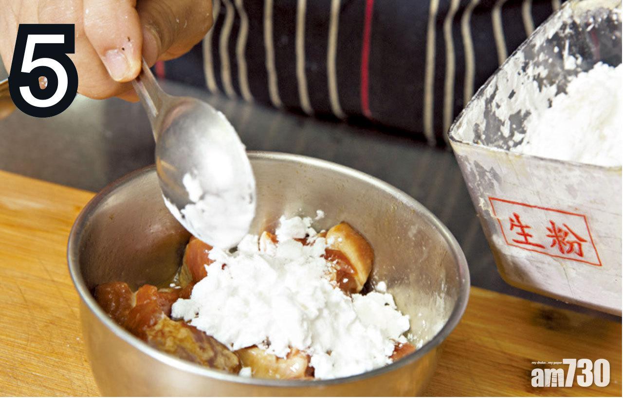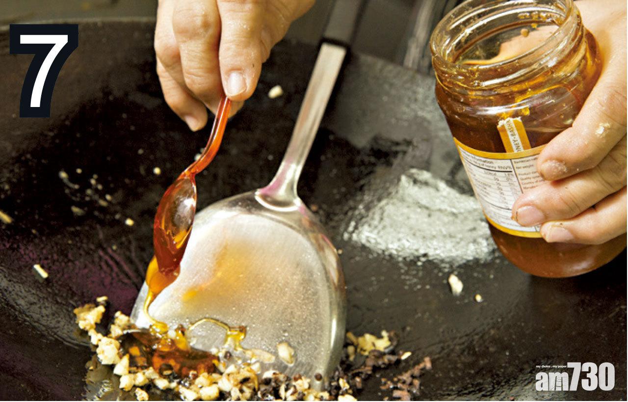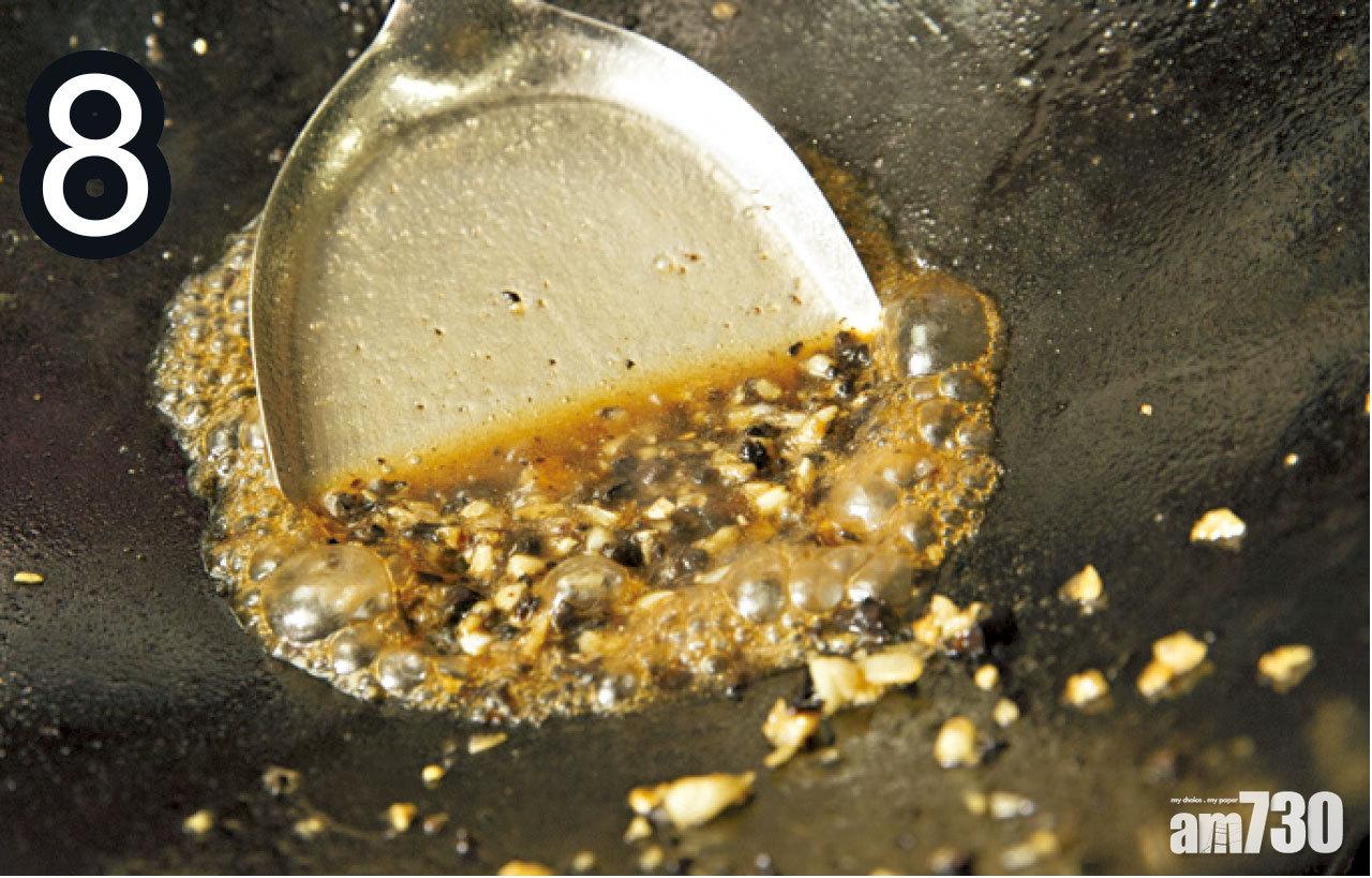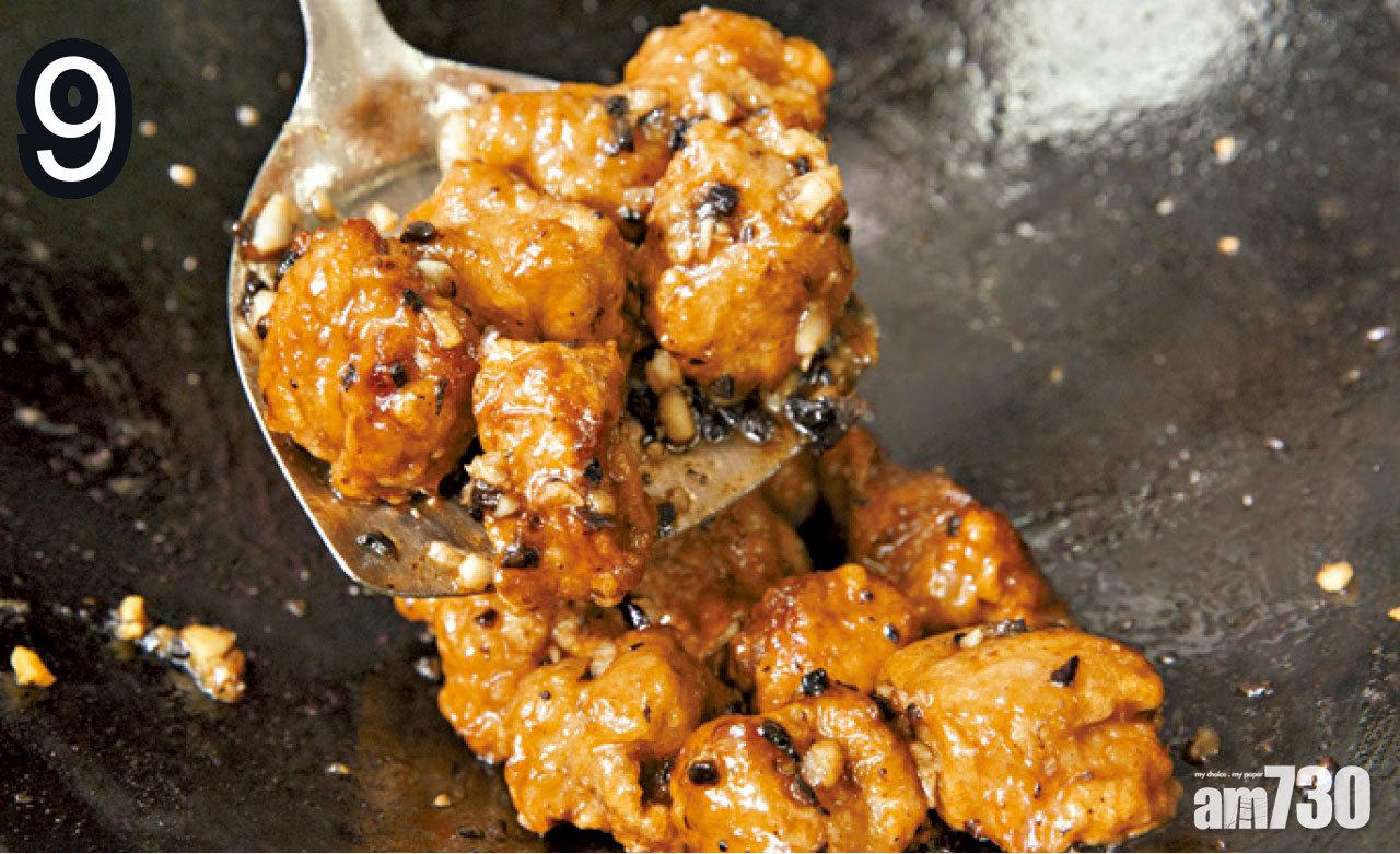 7-9. 油倒起,加入蒜茸炒片刻,加入欖角碎炒片刻,加入汁料推至微微稠身,將排骨加入兜勻至芡汁收乾。