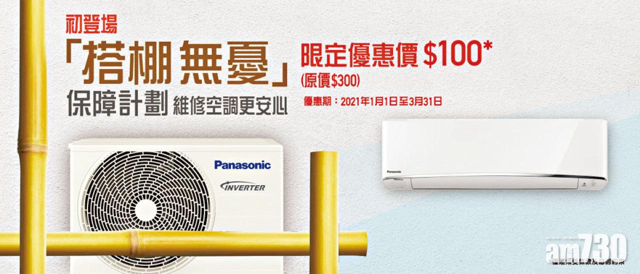 於2021年1月1日至3月31日期間購買Panasonic分體式空調機,包括Panasonic掛牆分體式空調機、窗口分體式空調及多聯掛牆分體式淨冷空調機,購買新機後20日內只需要100元(原價300元)就可以購買1年「搭棚無憂」保障計劃,於1年產品保修期內,享用多達2次搭棚服務,每年可申報兩次搭棚費用,而每次最高可申報之搭棚費用為3,000元,每年申報金額可以高達6,000元(只供空調機維修服務用)。另外,更可選購「早鳥保養+搭棚無憂」套餐計劃,享受更多折扣優惠,延長保養年期至兩年,每12個月可享有多達2次搭棚服務。