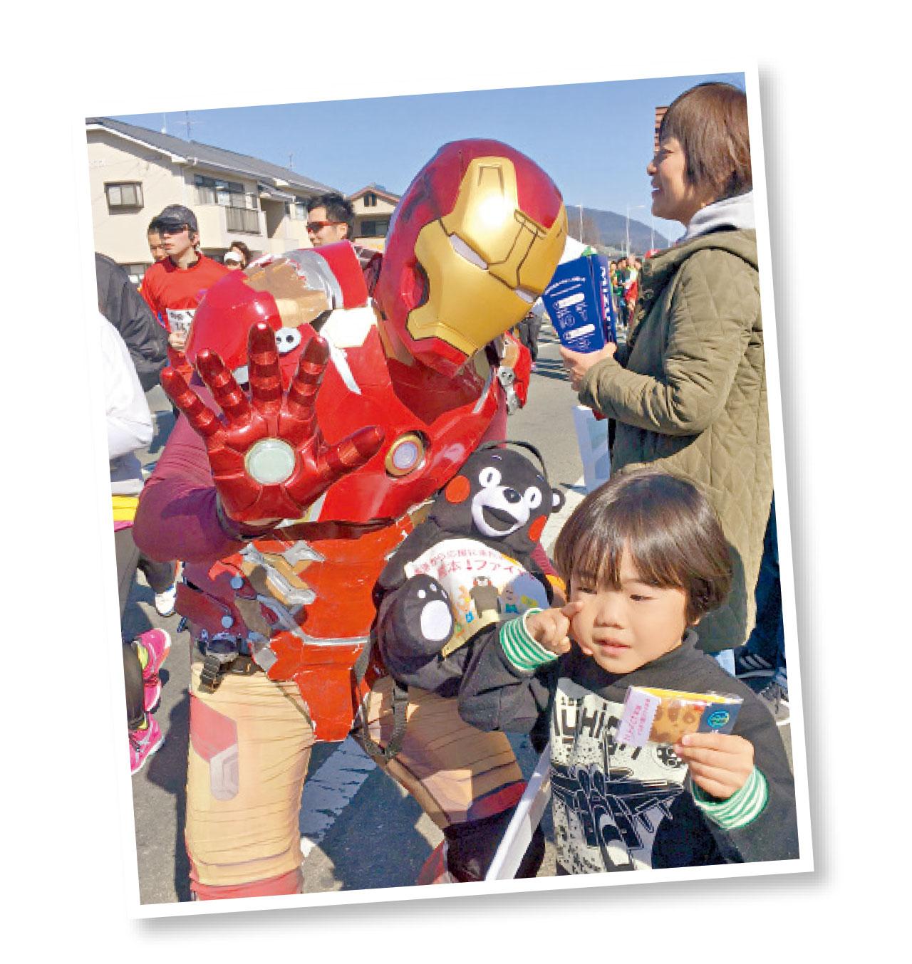 搞手之一莊曉陽話,今次係去年熊本地震後首個馬拉松活動,佢哋之前於香港已經組織咗一次熊本地震支援跑籌款,今次有位日本朋友話香港的奇華熊貓曲奇好可愛,佢認得呢個香港品牌,於是嘗試找奇華餅家贊助,對方爽快答應,於是自己搞埋包裝設計,人多好辦事,就咁十幾人帶埋包裝好的熊貓曲奇出發,邊跑邊派曲奇,當中來自香港的Iron Man鐵甲奇俠都出動,連當地傳媒亦有報道呢班香港親善大使!
