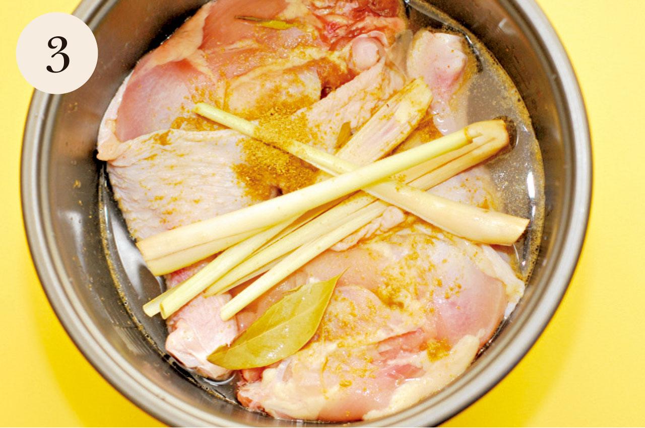 3.薑、雞腿、香葉、香茅放西施電飯煲內,加入160毫升水和胡荽粉。