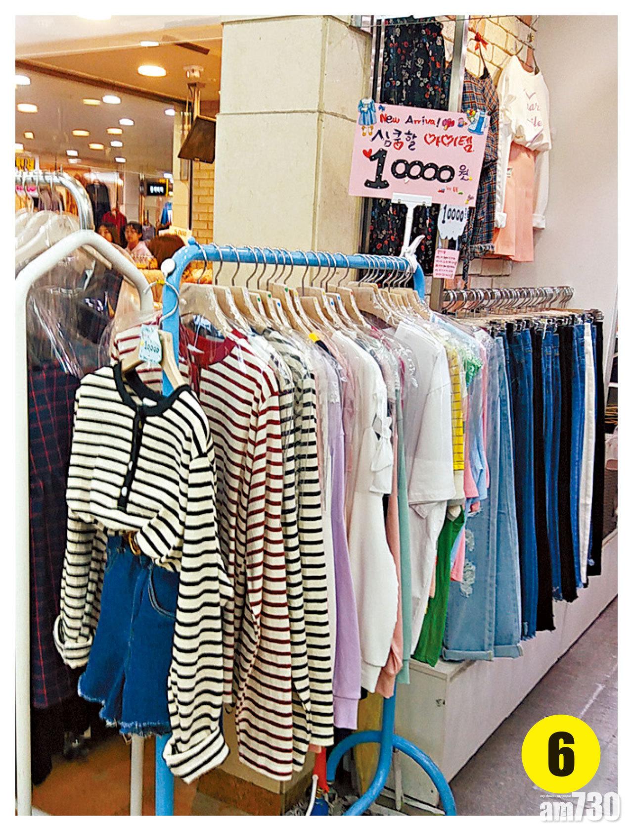 擁有600多間商店的地下街,裝潢有點似香港的葵涌廣場,而價錢非常便宜。在這裡經常出現10,000 Won(大約港幣70元)及5,000 Won(港幣35元)的價錢牌(當然亦有高級服飾但價錢會貴一點)。筆者本著「平靚正」目標,搜羅了好幾間店舖。近出口位置的10,000 Won店,排列了多件冷背心,如淺粉色冷背心非常百搭(圖5),又有大量條子上衣(圖6)及碎花連身裙(圖7)質素不錯。此外,有店舖為了方面客人挑選,特別以顏色分類,價錢只需5,000 Won(港幣$35,圖8)。還有近年流行的吊帶裙及格子長外套、針織上衣、毛衣等只需港幣70絕對平靚正。