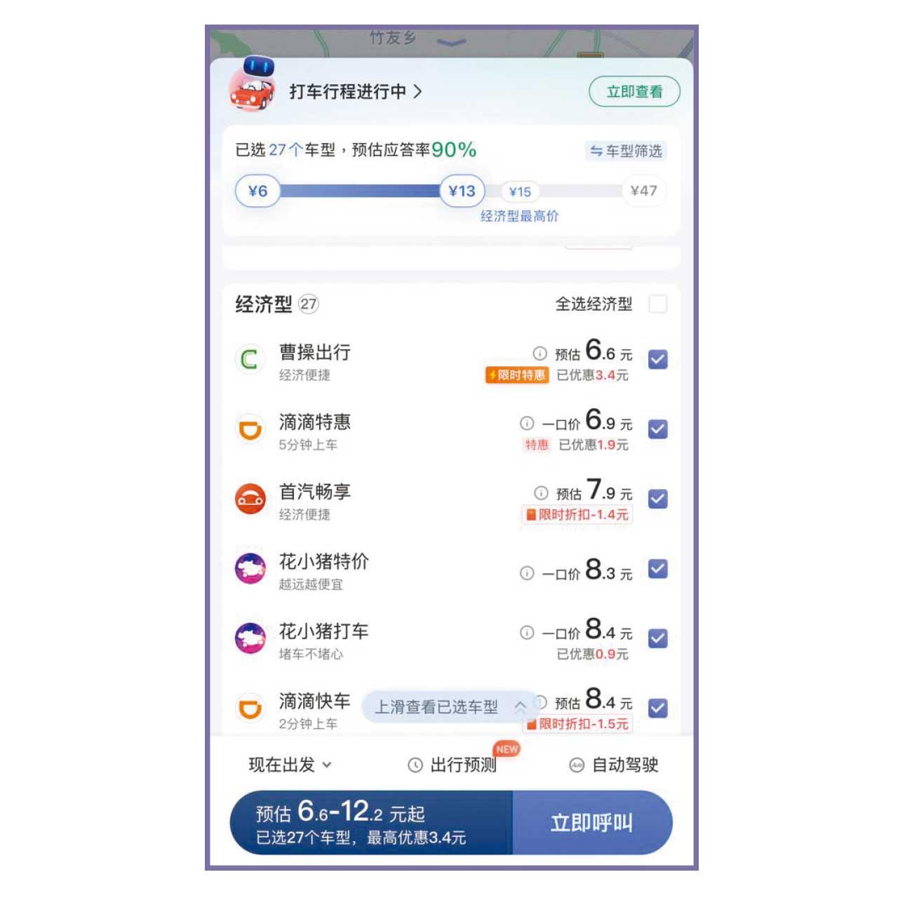 最貴當然是的士,40公里的距離,的士索價40元人民幣,網約車的價錢則介乎24至28元人民幣,還有15元人民幣的拼車,至少有十多間公司報價,不同網約車平台還有不同的報價,有的甚至相差一倍。另外一次搭車,曹操出行顯示6.6元人民幣、滴滴特惠6.9元人民幣、花小豬8.3元人民幣、滴滴快車8.4元人民幣、寶寶出行9.8元人民幣以及陽光出行9.5元人民幣,選擇之多,遠超港台。